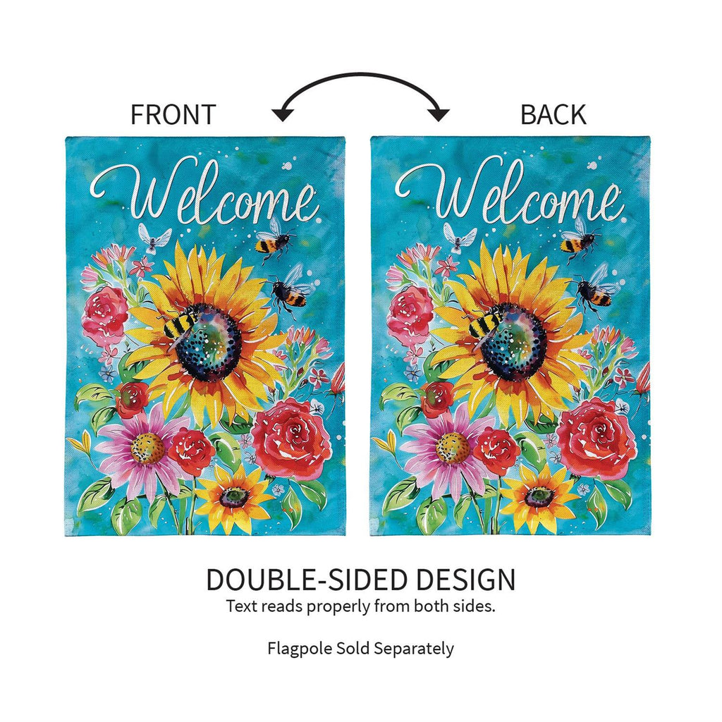 Welcome the vibrant energy of summer into your home with this Colorful Summer Blooms Burlap House Flag. Crafted from durable burlap, this flag features a stunning display of sunflowers and other bright blooms, accented by buzzing bees, all set against a vivid blue background. Measuring 44 inches in length and 28 inches in width, it's the perfect size to make a cheerful statement on your porch or in your garden. The word 'Welcome' invites guests with warmth and charm, making it an ideal seasonal addition to your outdoor décor.
