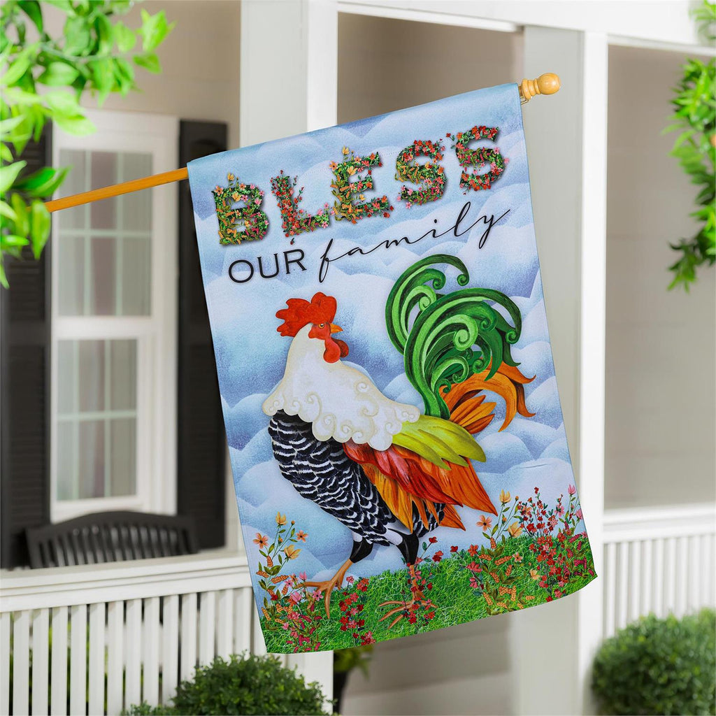 This charming flag adds an extra special touch to any home. It features a beautiful chicken surrounded by flowers. Flag is crafted of medium-weight suede fabric made from recycled plastic that provides a soft and durable texture. Artwork is heat transferred onto the sun-blocking material so that it is easily viewed from both sides. The weatherproof flag will not fray or fade with continued outdoor use. This flag features a sleeve for use with any standard flagpole or stand, sold separately.