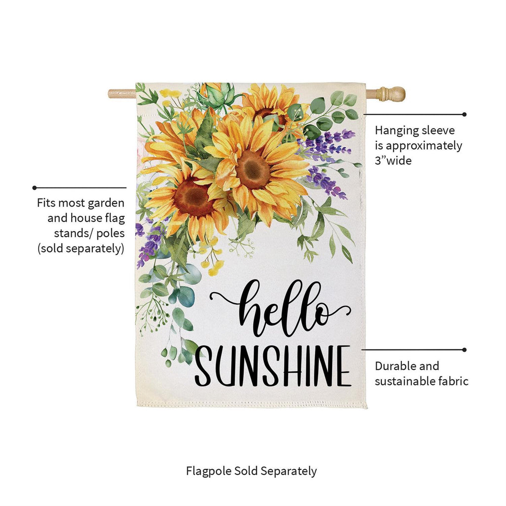 Brighten up your outdoor space with the Hello Sunshine Sunflower Suede House Flag. Measuring 43 inches long and 29 inches wide, this flag is designed to bring warmth and cheer to any home. The vibrant sunflower design is beautifully printed on high-quality suede, ensuring a rich texture and durable finish. Perfect for welcoming guests during the spring and summer months, this flag is sure to make a charming statement on any porch or garden. Its cheerful message and colorful floral arrangement will spread joy throughout your neighborhood.