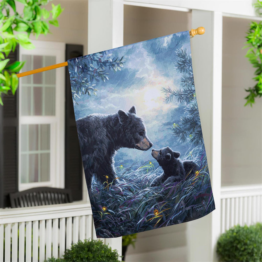 This charming flag adds an extra special touch to any home. It features a beautiful realistic depiction of a bear family in the woods. Flag is crafted of medium-weight suede fabric made from recycled plastic that provides a soft and durable texture. Artwork is heat transferred onto the sun-blocking material so that it is easily viewed from both sides. The weatherproof flag will not fray or fade with continued outdoor use. This flag features a sleeve for use with any standard flagpole or stand, sold separately.