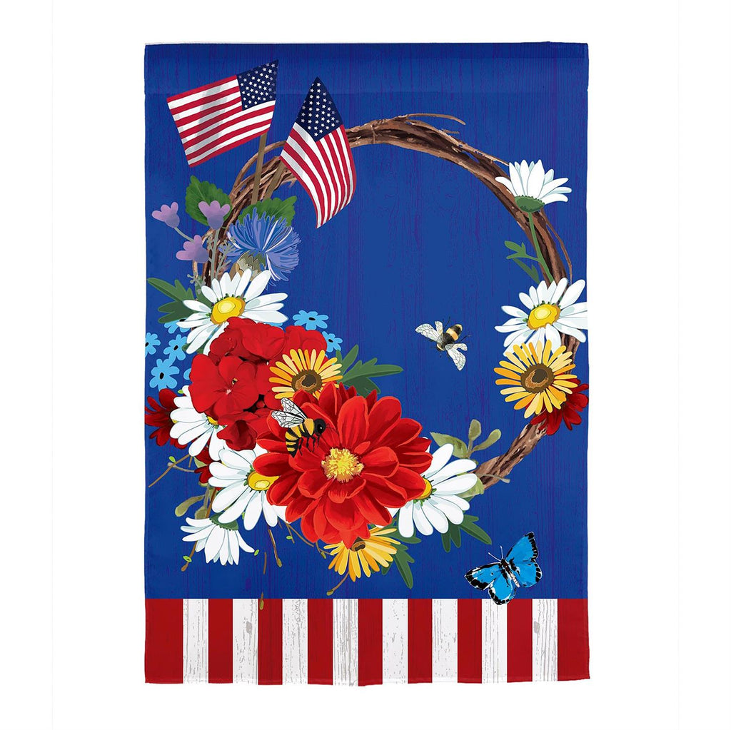 This charming flag adds an extra special touch to any home. It features a colorful patriotic design that’s bright colors and detailed design is sure to catch everyone’s attention. Each Evergreen applique flag is carefully crafted from multiple layers of 310 denier nylon made from recycled plastic that can withstand a variety of weather conditions. We combine pieces of fade-resistant, strong fabric with tight, detailed stitching to create a dimensional mosaic effect. The soft yet heavyweight material illuminates beautifully in sunlight. Each flag features a sleeve that fits standard flagpoles or stands, sold separately. Due to the nature of the packaging, wrinkling may have occurred. Once item is unfolded and mounted on hardware, the creases will naturally fall out. Spot clean only. Never put in a dryer. When not in use, flags can be hung in a closet or placed in a storage container.