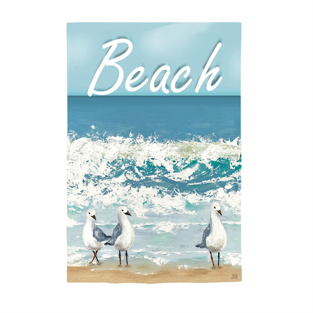 This charming flag adds an extra special touch to any home. Features lively colors and attractive Seagulls On The Beach design. Flag is crafted of medium-weight suede fabric made from recycled plastic that provides a soft and durable texture. Artwork is heat transferred onto the sun-blocking material so that it is easily viewed from both sides. The weatherproof flag will not fray or fade with continued outdoor use. This flag features a sleeve for use with any standard flagpole or stand, sold separately.