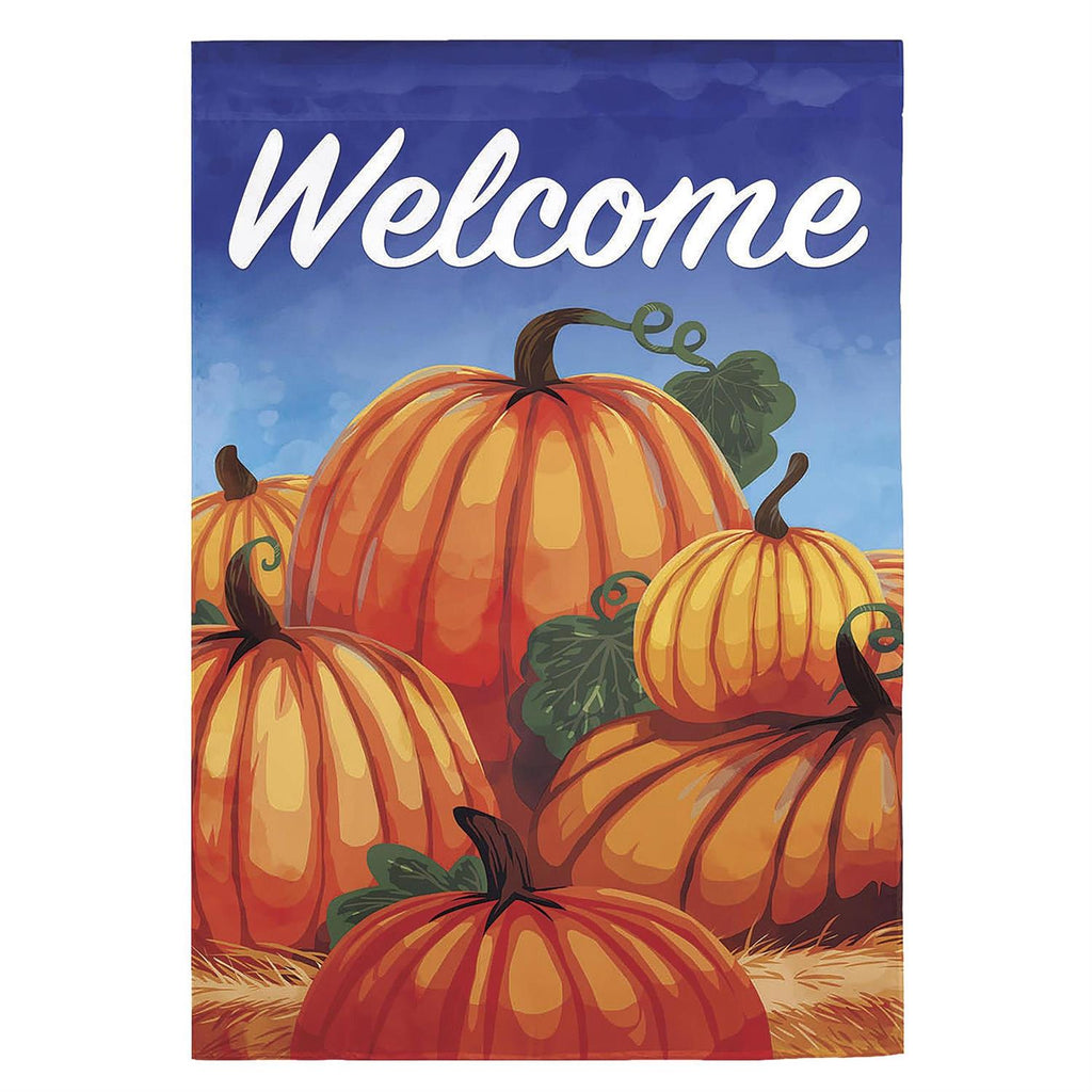 Celebrate the vibrant colors of fall with the Welcome Pumpkin Patch Applique House Flag. Measuring 28 inches in width and 44 inches in height, this flag beautifully showcases a delightful pumpkin patch scene against a serene blue sky. Crafted with high-quality fabric, the applique design adds depth and texture, making it a standout piece for your home's exterior. Perfect for welcoming guests during the autumn season, this flag is a charming addition to any outdoor décor.