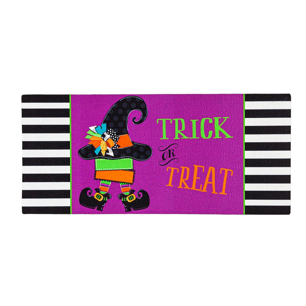 Welcome the Halloween spirit into your home with the Trick Or Treat Witch Sassafras Switch Mat. Measuring 22 inches long and 10 inches high, this mat features a whimsical witch's legs design set against a vibrant striped background. Crafted for seasonal charm, it’s perfect for adding a touch of fun to your doorstep. The durable construction ensures it withstands the hustle and bustle of trick-or-treat night, while the low-profile design fits comfortably in any entryway. Whether used indoors or out, this mat is a delightful way to greet guests and celebrate the spooky season.