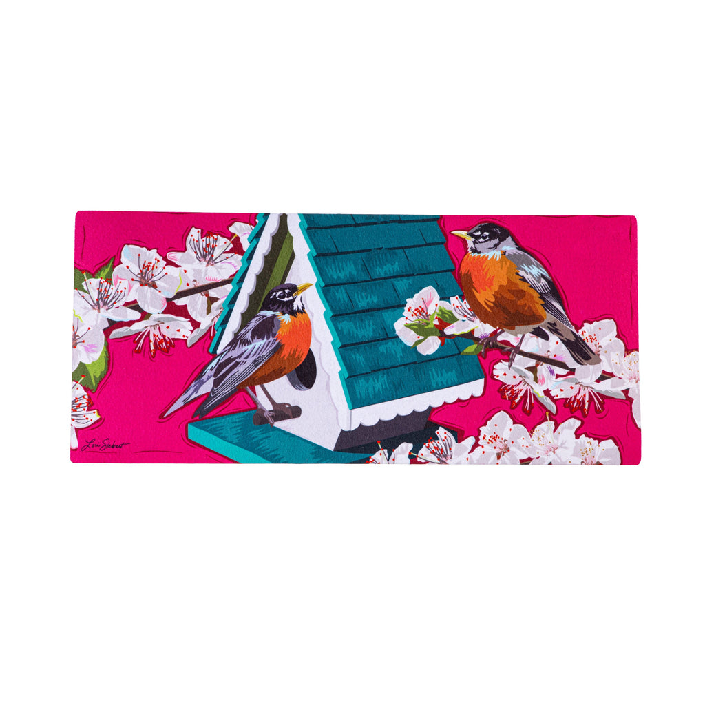 Give guests a warm welcome with this Sassafras Switch Mat. It features darling birds perched on a colorful birdhouse and surrounded by flowers. Crafted from heat-sublimated polyester with a rubber backing, this versatile mat is designed to fit perfectly within Evergreen's switch doormat bases. The mildew resistant mat is ideal for indoor or outdoor use and features a skid-resistant backing to help keep it in place. This welcoming mat will freshen up your stoop season after season while ensuring your home stays debris-free. For stains, simply spot clean with soap and warm water.