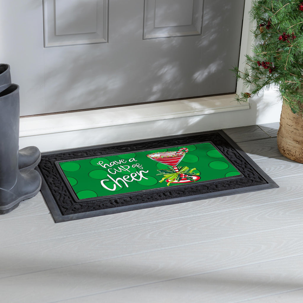 Add a festive touch to your doorstep with the Have A Cup Of Cheer Sassafras Switch Mat. Measuring 22 inches in width and 10 inches in height, this mat is perfect for the holiday season. The vibrant green background features playful polka dots and a cheerful cocktail design, inviting guests to embrace the spirit of celebration. Made for use with Sassafras mat trays, this durable insert is ideal for indoor or outdoor use. Elevate your entryway with a touch of holiday charm and spread cheer to all who visit.