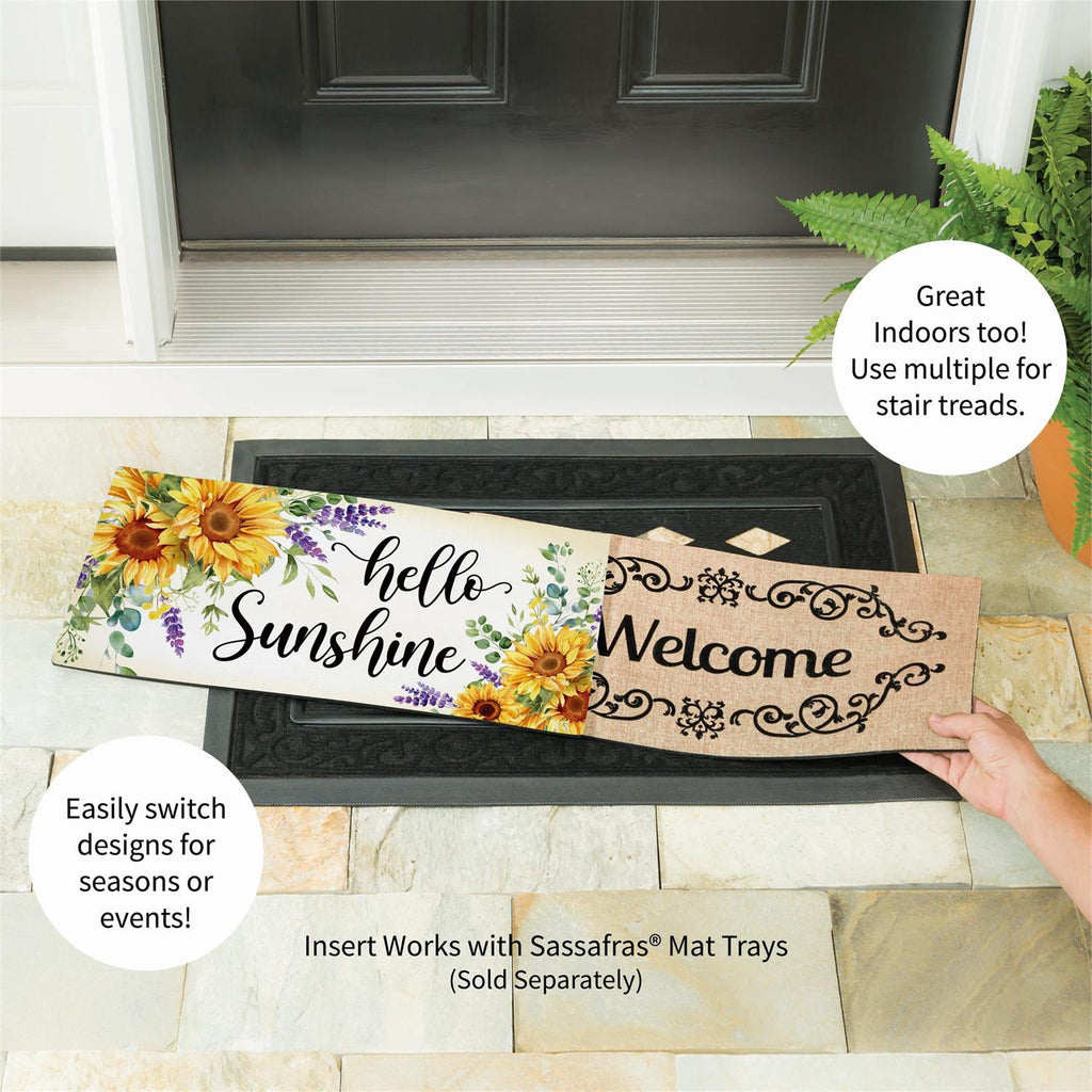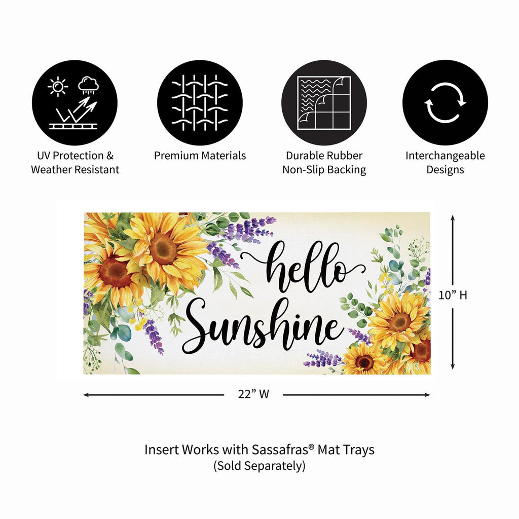 Brighten up your entryway with the Hello Sunshine Sunflower Sassafras Switch Mat. This charming 22 x 10-inch insert features a vibrant display of sunflowers and lavender, perfectly capturing the essence of a sunny day. Designed to fit effortlessly into your existing Sassafras mat base, this insert is ideal for seasonal updates or year-round use. The low-profile design ensures easy door clearance, while the durable construction withstands outdoor elements. Welcome guests with a cheerful vibe that complements any porch or patio decor.