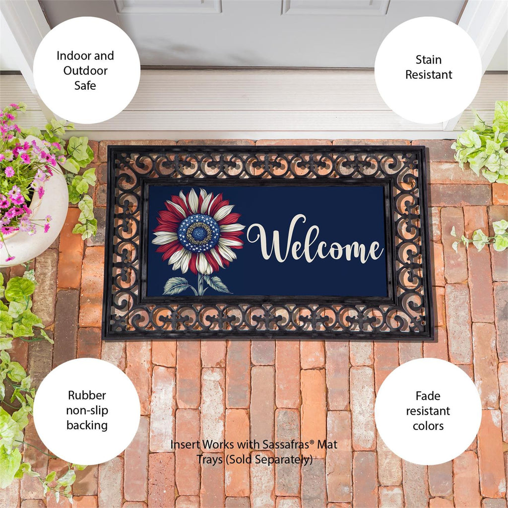 Welcome guests with the charming Patriotic Vibrant Sunflower Sassafras Switch Mat. This mat insert features a striking sunflower design with patriotic elements, perfect for celebrating American pride. Made to fit Sassafras mat trays, it measures 22 inches by 10 inches, making it ideal for any entryway. Constructed to withstand both indoor and outdoor use, its vibrant colors resist fading while the rubber non-slip backing ensures stability. Add a touch of seasonal flair to your home with this versatile and durable accent piece.