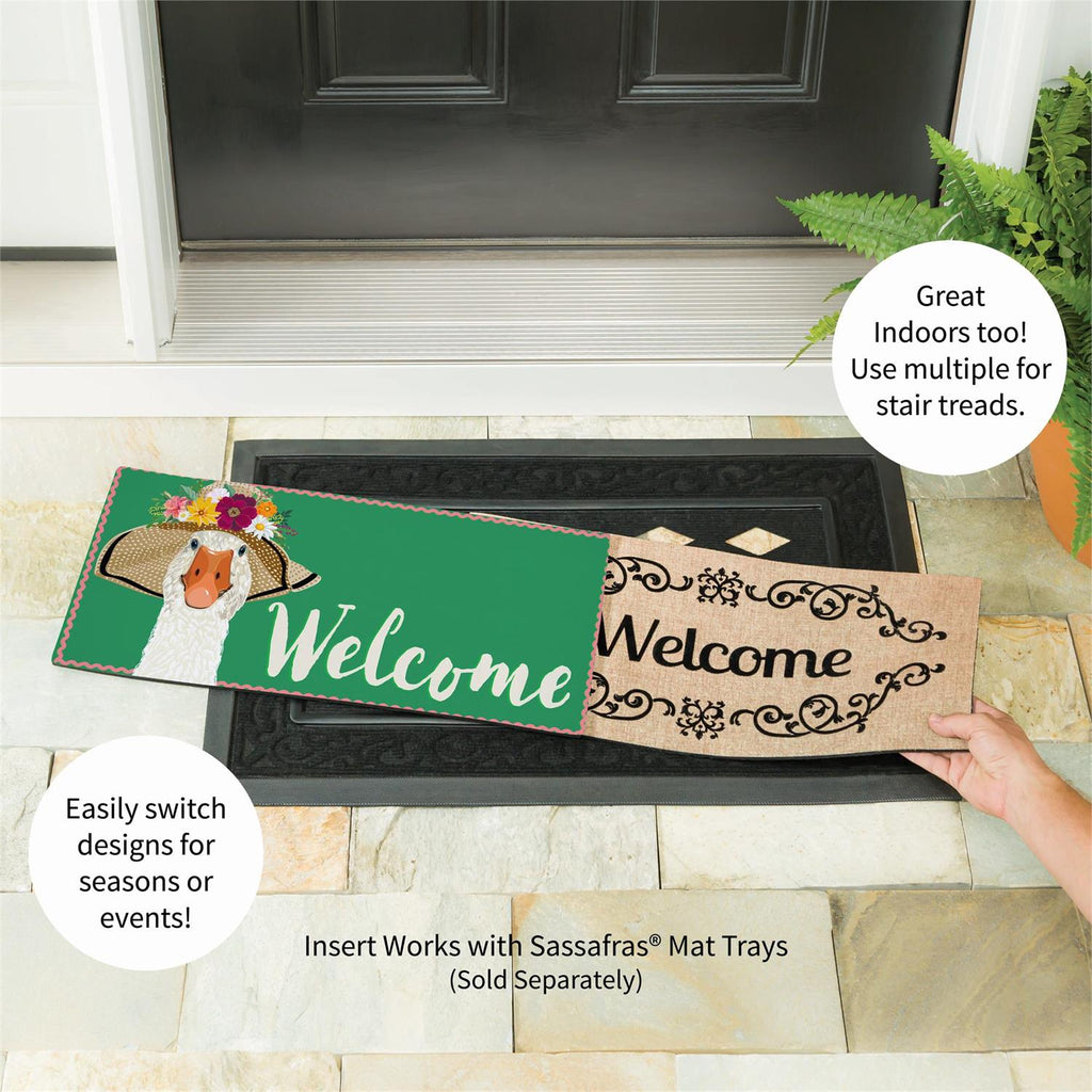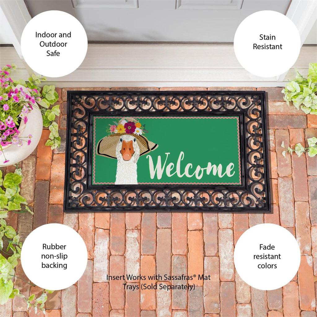 Welcome guests with a touch of whimsy using the Flowery Goose Sassafras Switch Mat. This charming doormat insert features a delightful goose adorned with a floral hat, set against a vibrant green background. Perfect for seasonal transitions, this mat adds personality to any entryway. Its slim profile fits effortlessly into Sassafras mat trays or can be used on its own. Designed for both indoor and outdoor use, it combines style and functionality to keep your home inviting.