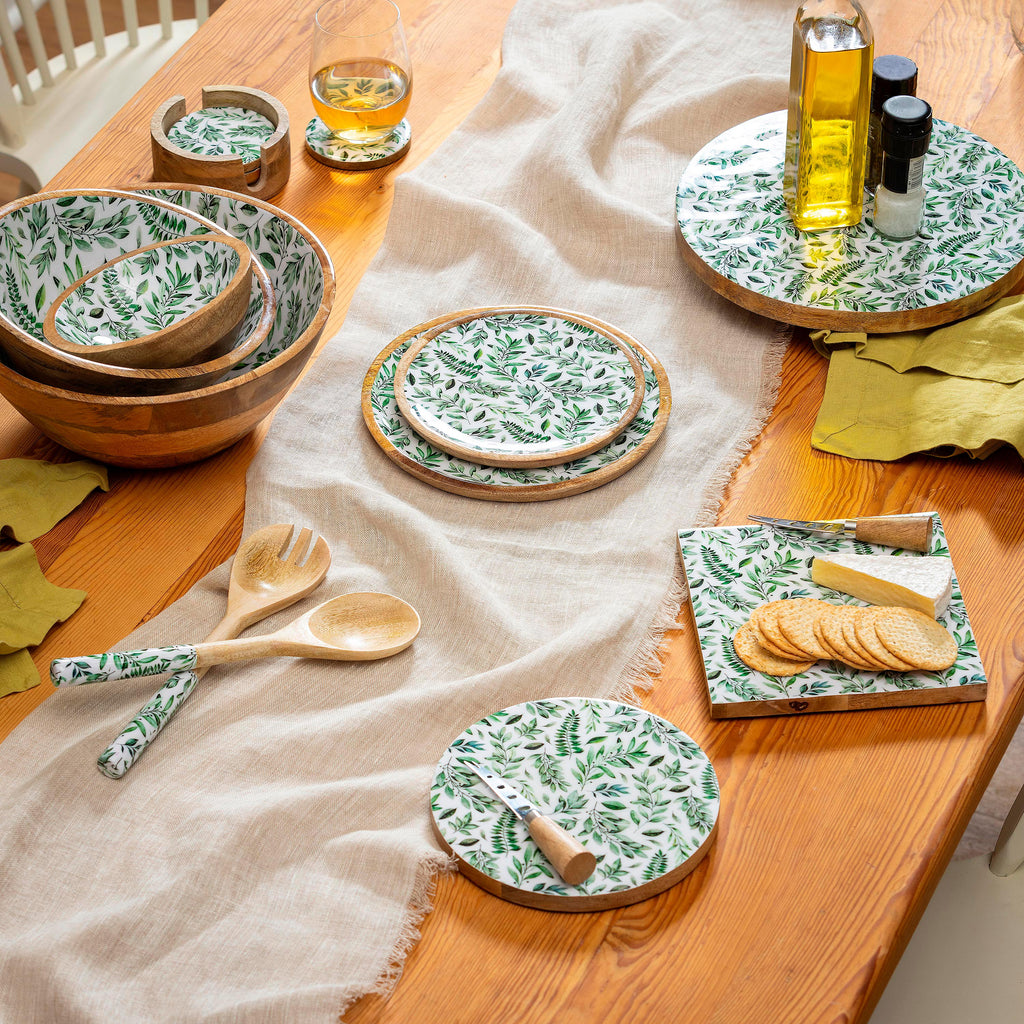 Elevate your entertaining with the Olive Oasis Wood Cheese Board with Knife Set, featuring a vibrant leaf pattern. Ideal for serving cheeses and appetizers stylishly.