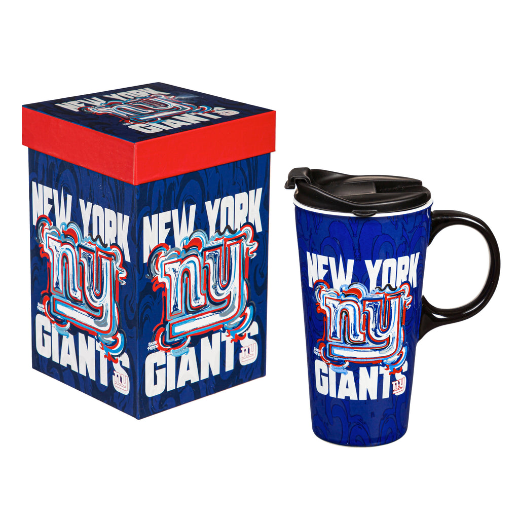 Show off your team pride with this New York Giants travel latte cup, featuring a vibrant design by Justin Patten. Perfect for on-the-go fans, this cup blends style and functionality.