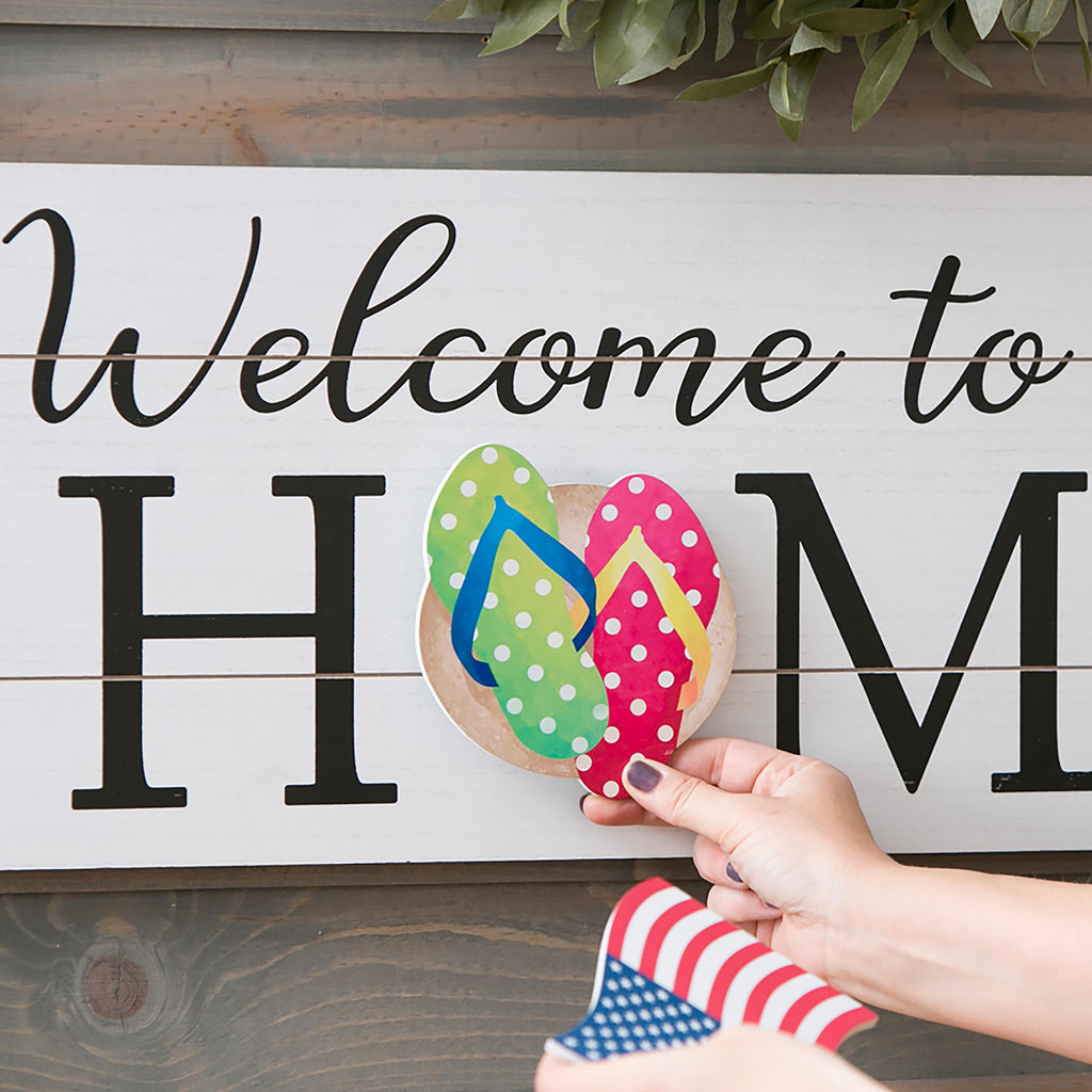 This interchangeable wood sign features 'Welcome To Our Home' with various seasonal icons, perfect for adding a personal touch to any indoor space.