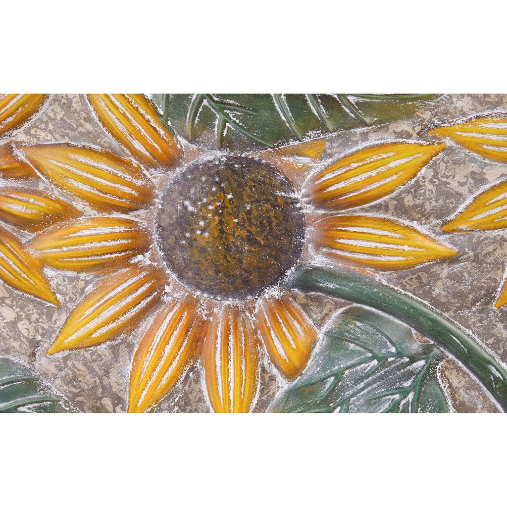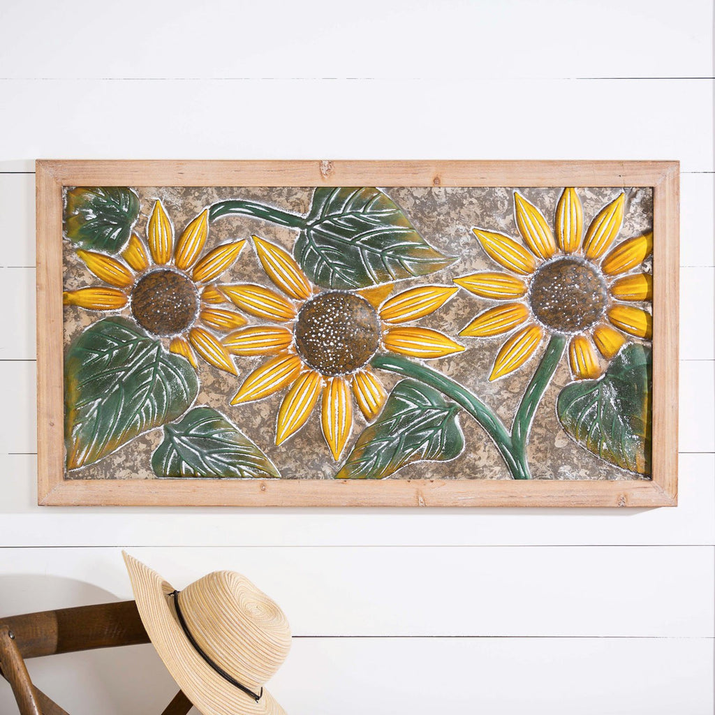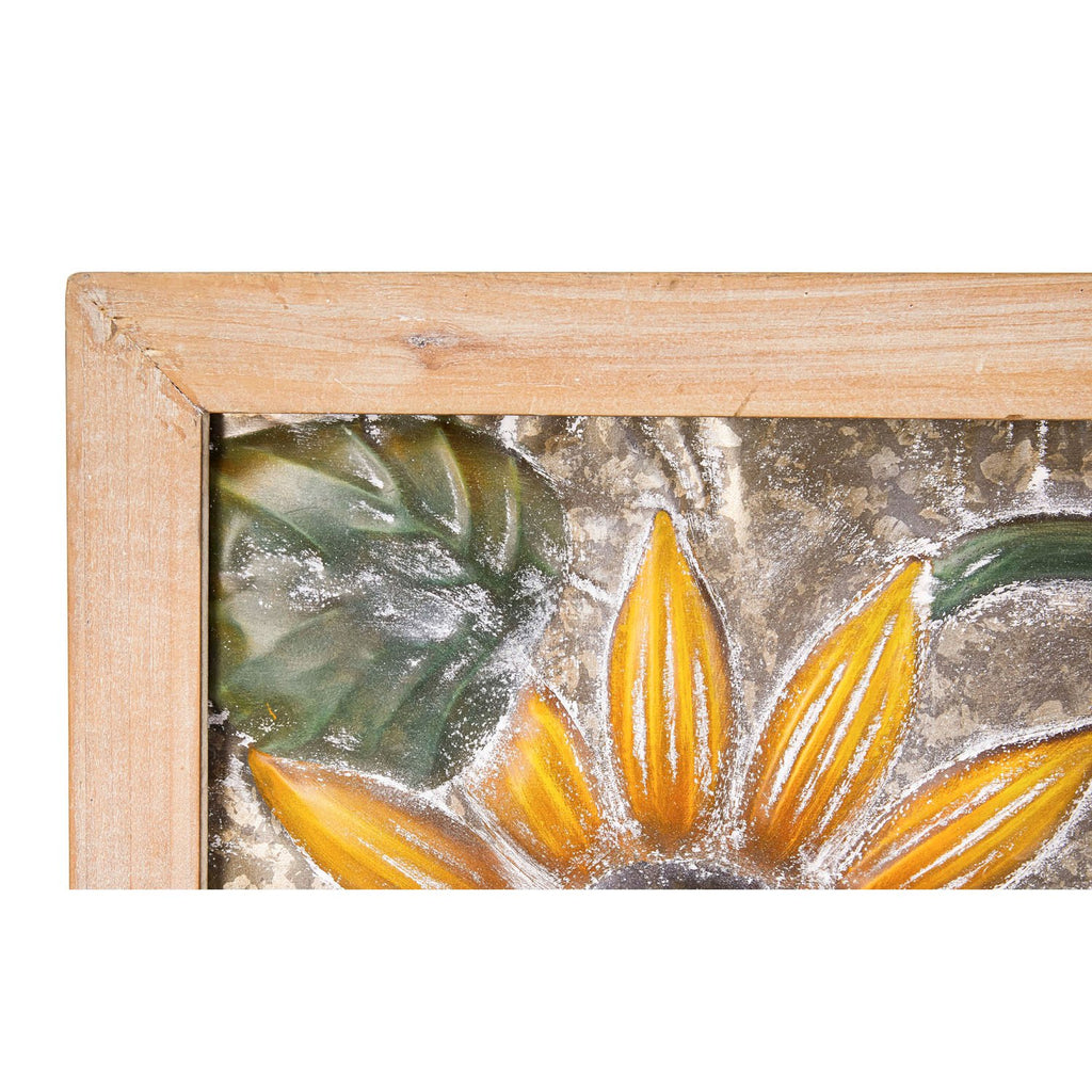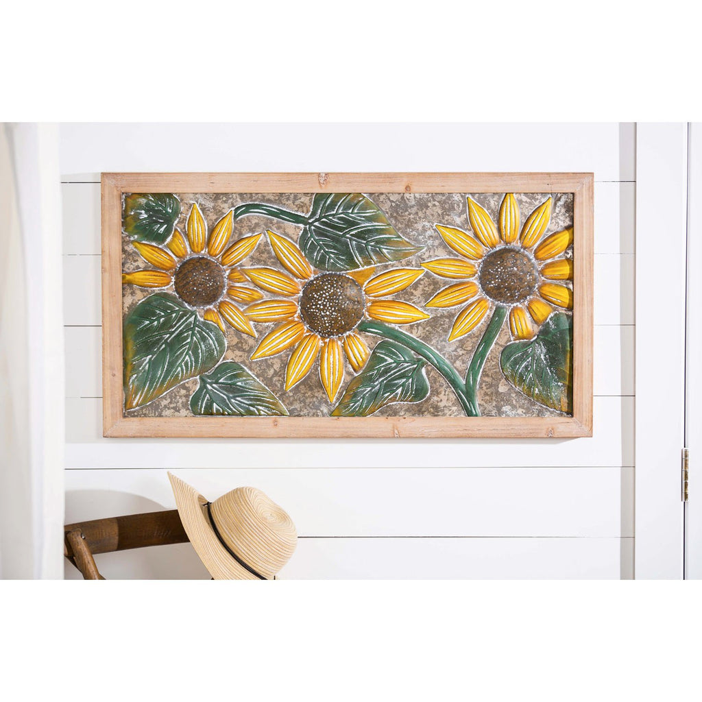 Enhance your living space with the Petal & Plow Indoor Wall Decor, featuring embossed sunflowers in a striking metal design with a wooden frame.