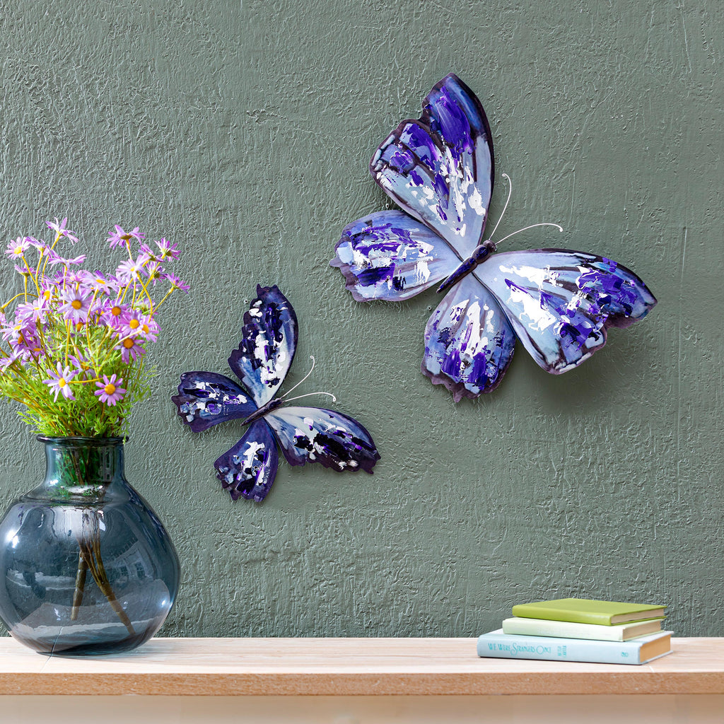 Enhance your interior space with this charming set of two purple butterfly metal wall decor pieces, adding a touch of nature-inspired elegance to any room.