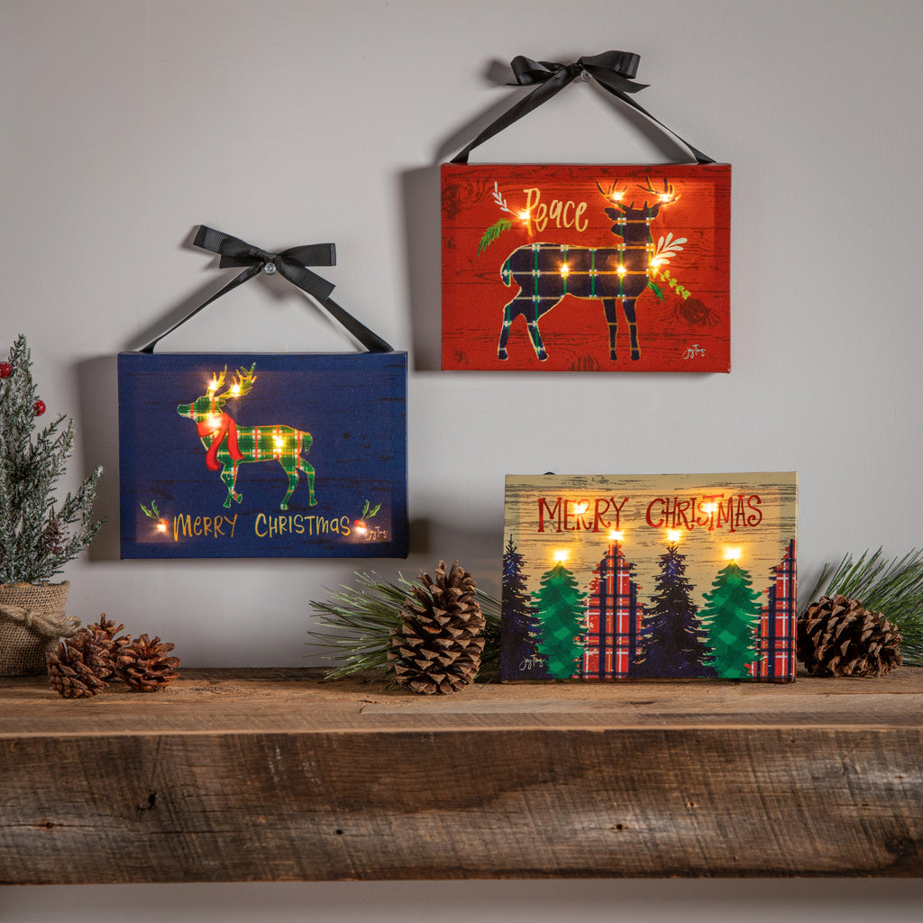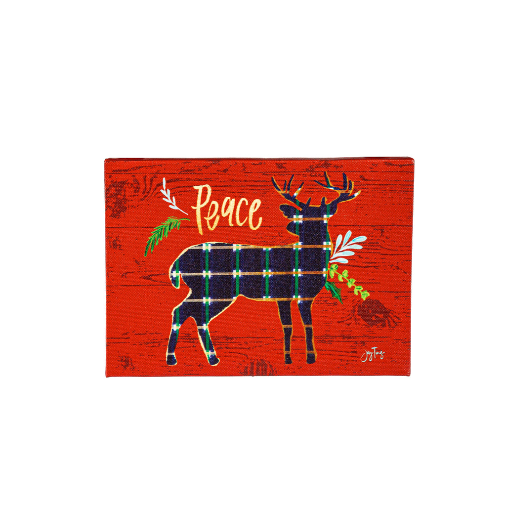 Illuminate your home with the festive charm of the Mini LED Canvas featuring a plaid deer and trees design. Measuring 8 inches high and 6 inches long, this indoor wall décor piece combines rustic holiday motifs with vibrant LED lights, creating a warm and inviting atmosphere. The plaid patterns and seasonal greetings add a touch of traditional Christmas spirit, while the LED lights gently highlight the artwork. This canvas is perfect for adding a cozy and cheerful accent to any room during the holiday season.
