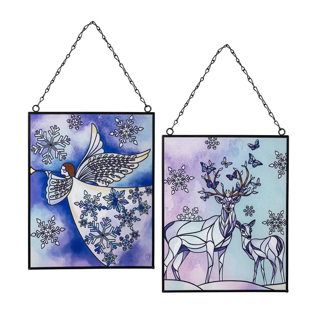 Add a touch of winter magic to your home with the Season to Sparkle Wall Decor set. Featuring two stunning pieces of ice stained glass, each panel showcases intricate designs of seasonal motifs. The vibrant blues and purples capture the essence of a frosty wonderland, while the delicate craftsmanship enhances the beauty of these artworks. Perfect for any room needing a splash of color and elegance during the colder months. These panels are not only a visual delight but also a testament to exquisite artistry, making them a timeless addition to your indoor decor.