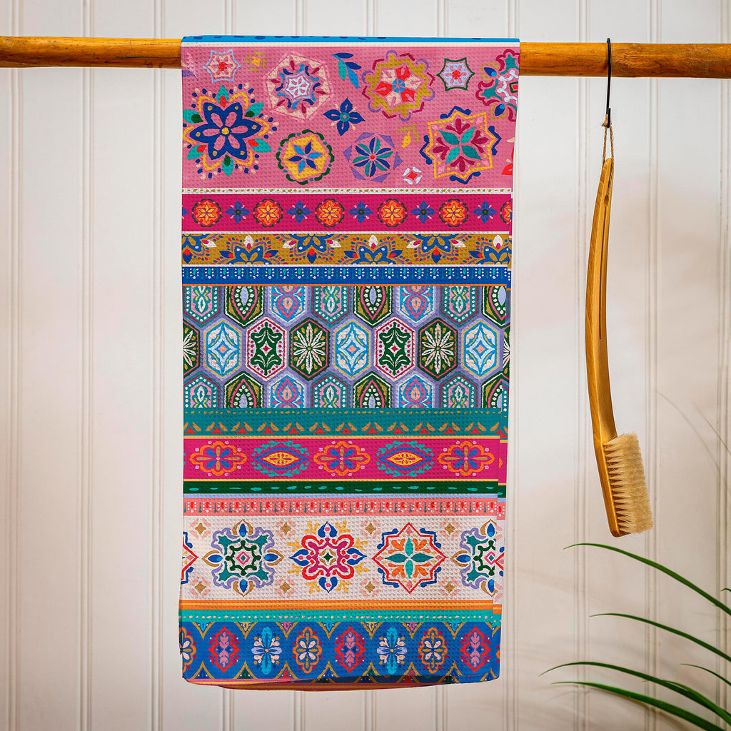 Brighten up your bathroom or beach outing with this vibrant geometric tapestry quick-dry towel. It features a bold design and comes with a matching carrying case for easy transport.