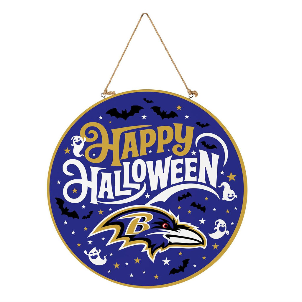 Celebrate Halloween and show your team spirit with the Baltimore Ravens Halloween Round Door Décor. Measuring 18 inches in diameter and crafted with vibrant colors, this eye-catching piece is perfect for any Ravens fan looking to add a festive touch to their home. The lightweight design and included hanging rope make it easy to display on your front door or any indoor wall. Featuring spooky graphics and the iconic team logo, this décor piece is ideal for welcoming trick-or-treaters or guests to your Halloween party.