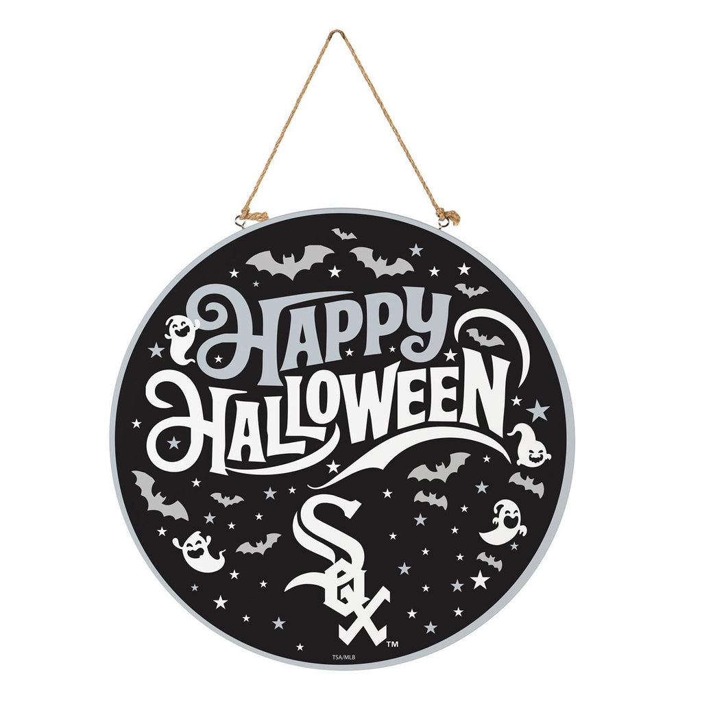 Celebrate Halloween with a touch of team spirit using this Chicago White Sox Halloween Round Door Décor. Measuring 18 inches in diameter, this indoor wall decoration adds a festive and sporty flair to your home. Made from durable materials, it features a stylish black and white design with playful Halloween elements and the iconic White Sox logo. The included hanging rope makes it easy to display on any door or wall, making it a perfect addition to your seasonal décor. Show your team pride while welcoming trick-or-treaters with this fun and functional piece.