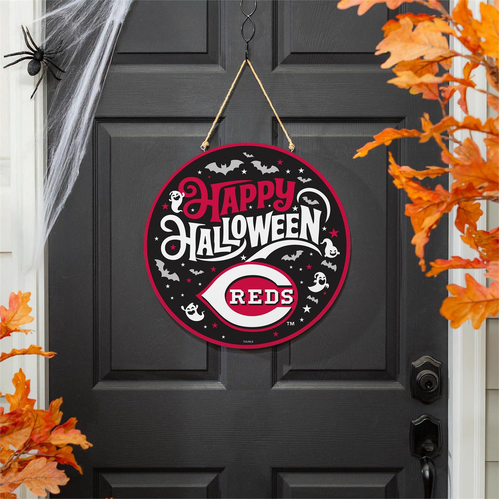 Celebrate the spooky season in style with the Cincinnati Reds Halloween Round Door Décor. This 18x18 inch indoor wall décor piece is perfect for fans who want to combine their love for baseball with festive Halloween spirit. Made with a durable design, it features a striking combination of black, red, and white hues, adorned with bats and ghostly elements. The included hanging rope makes it easy to display on any door, adding a playful touch to your home or office décor. Perfect for showing team spirit while celebrating Halloween.