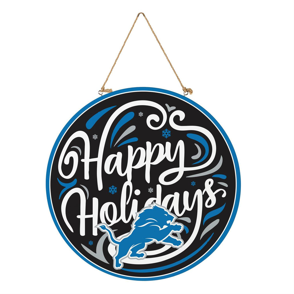 Celebrate the holiday season with a touch of team spirit by displaying the Detroit Lions Holiday Round Door Décor. This 18x18 inch wall décor piece is perfect for fans looking to combine festive cheer with their love for the Lions. Crafted from durable materials, it features a bold 'Happy Holidays' message surrounded by the iconic team logo. The included hanging rope makes it easy to display on any door or wall, offering a stylish and spirited way to welcome guests during the holidays. Ideal for indoor use, it's a great addition to any fan's home décor collection.