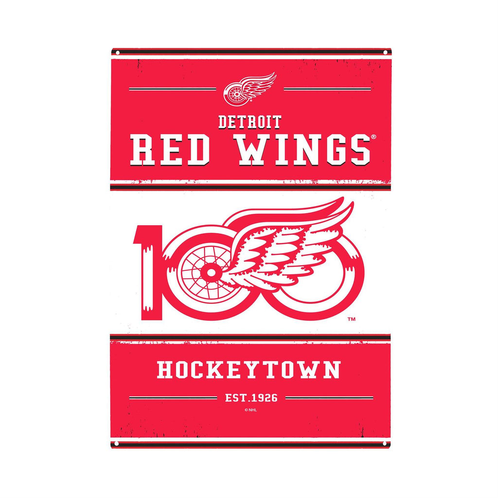 Celebrate a century of hockey heritage with this Detroit Red Wings 100th Anniversary Metal Wall Sign. Measuring 11.5 inches by 15.5 inches, this vibrant red sign features the iconic Red Wings logo and commemorates the team's longstanding legacy in the NHL. Made from durable metal, it offers a vintage look that fits perfectly in any fan's home, office, or game room. Pre-drilled holes make for easy hanging, ensuring you can proudly display your allegiance to Hockeytown with minimal effort. This piece is a must-have for any devoted Red Wings supporter.