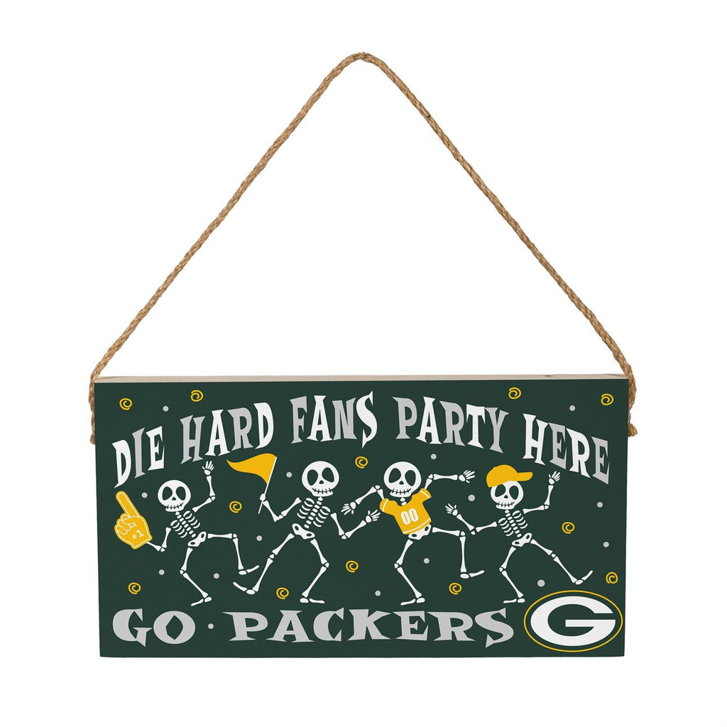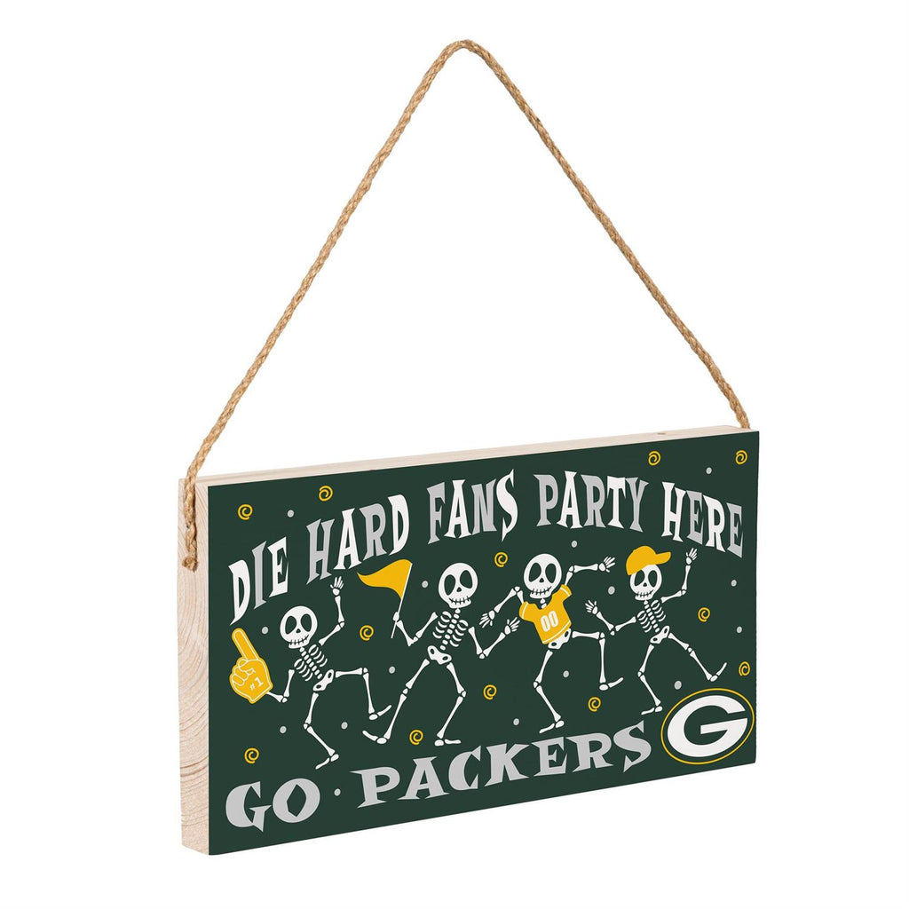 Celebrate Halloween and show your team spirit with this Green Bay Packers Wood Wall Sign. Measuring 6x11 inches, this sign is perfect for fans who love to combine their passion for football with festive holiday décor. Made from sturdy wood, it features playful skeleton graphics and team colors, making it an eye-catching addition to any room or party setting. The rope hanger adds a rustic touch, making it easy to display on walls, doors, or entryways. Whether you're hosting a game-day gathering or just want to add some spirited fun to your home, this sign is a must-have for die-hard Packers fans.