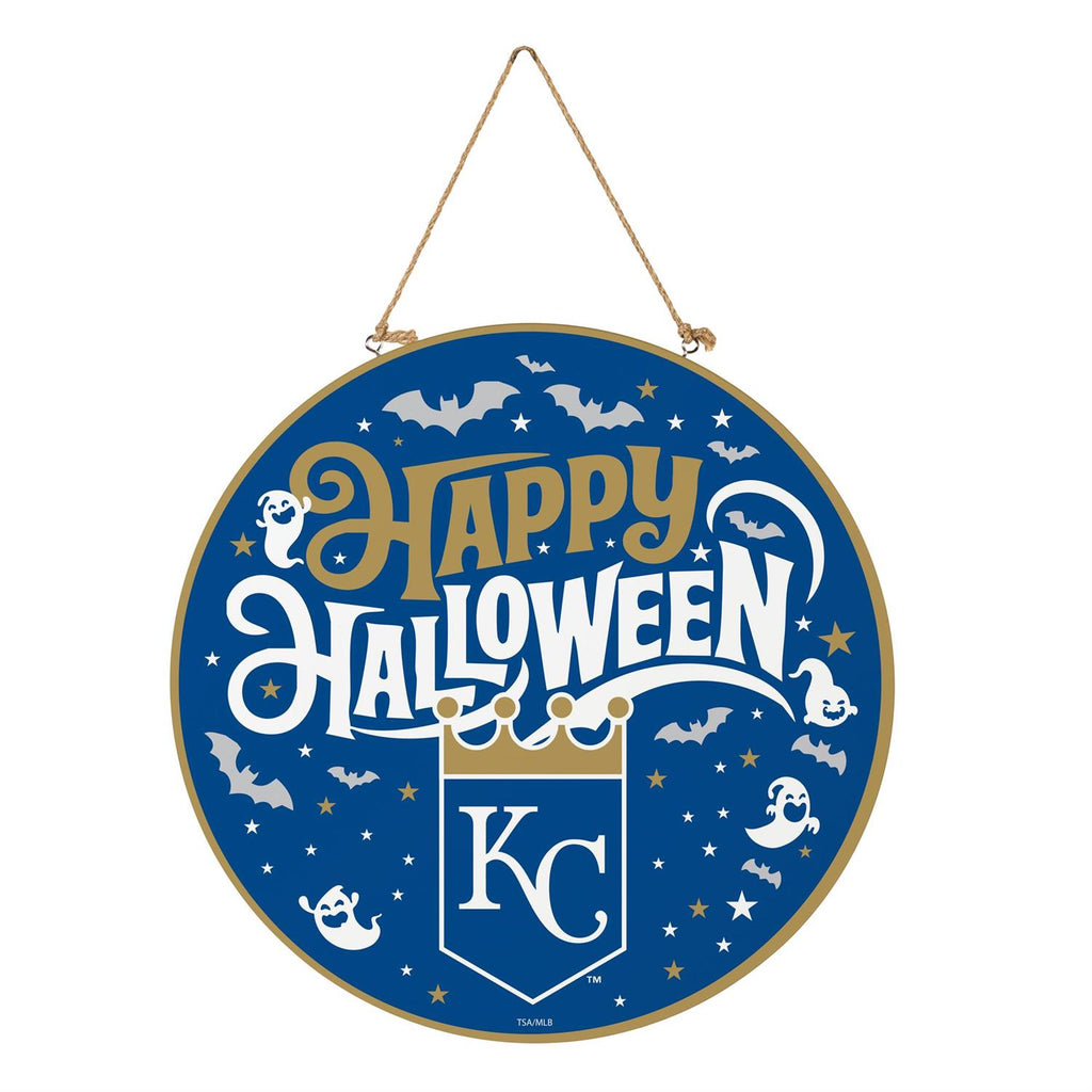 Celebrate Halloween with a sporty twist using the Kansas City Royals Halloween Round Door Décor. Perfect for fans who love to showcase their team spirit, this 18x18 inch round décor piece features a festive design with bats, ghosts, and stars surrounding a bold "Happy Halloween" message. Crafted for indoor use, it comes with a sturdy hanging rope, making it easy to display on any door. The combination of Halloween motifs and team pride makes it an ideal addition to your seasonal decorations.