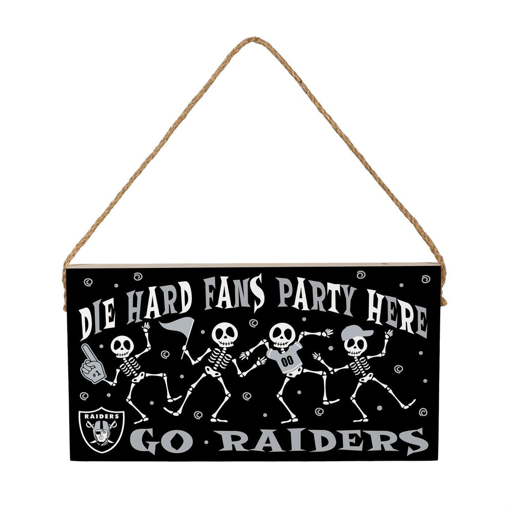 Celebrate your team spirit this Halloween with the Las Vegas Raiders Halloween Wood Wall Sign. Measuring 6x11 inches, this sign is crafted from durable wood and features a festive design with skeletons and team logos. The black background and bold white lettering make it a standout piece for any Raiders fan. Hang it easily with the attached rope for quick and convenient display. Perfect for adding a spooky touch to your home or game day party, this sign lets everyone know where die-hard fans gather.