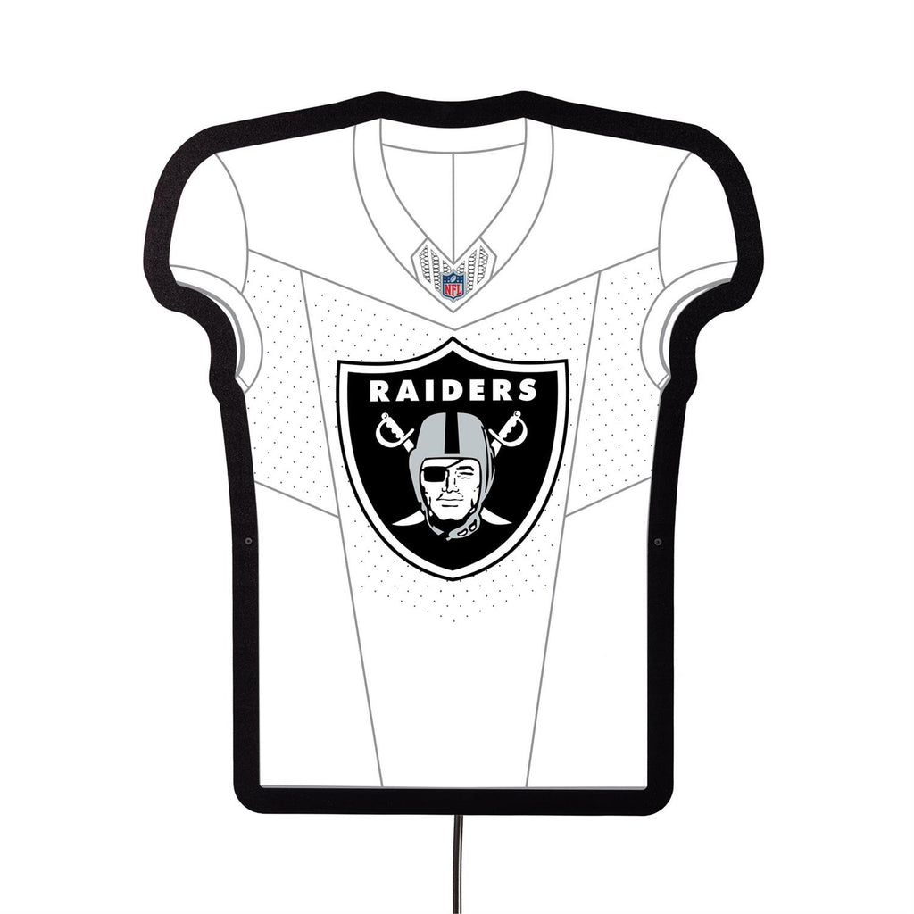 Illuminate your space with the Las Vegas Raiders NFL Football Jersey Edgelite LED Decor. Perfect for any fan, this wall décor piece brings team spirit into your home with a striking LED design shaped like a Raiders jersey. Measuring 23 inches by 23 inches, it's an ideal size for game rooms, bedrooms, or man caves. The slim profile at 0.38 inches ensures it fits seamlessly on any wall. Enjoy the glow and show off your allegiance to the Raiders with this vibrant and stylish décor piece.