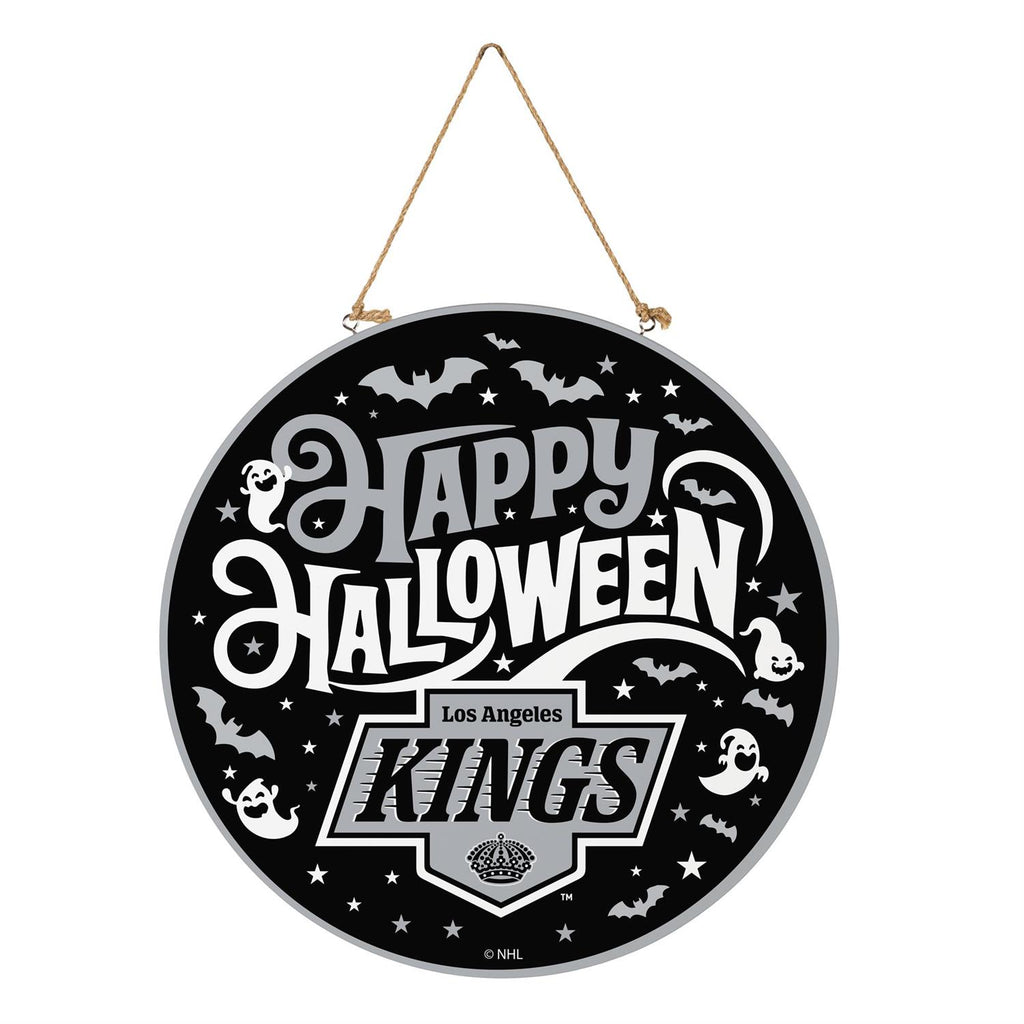 Celebrate Halloween with a sporty twist using the Los Angeles Kings Halloween Round Door Décor. Perfect for fans and Halloween enthusiasts alike, this 18x18 inch wall décor adds a festive touch to any indoor space. Crafted with a sleek black and white design featuring playful Halloween motifs, it’s both stylish and spirited. The included hanging rope makes it easy to display on doors or walls, offering a simple yet eye-catching decoration for the season. Whether you're hosting a Halloween party or just showing your team pride, this piece is a fantastic addition to your seasonal decorations.