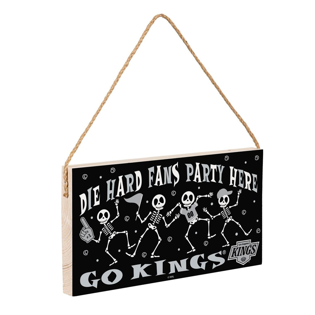 Celebrate Halloween and your love for the Los Angeles Kings with this vibrant wood wall sign. Measuring 6x11 inches, it's perfect for adding a festive touch to your home décor or party setup. The sign features playful skeletons and bold text, making it an eye-catching piece for die-hard fans and Halloween enthusiasts alike. Hang it easily with the included jute rope, and let everyone know where the party begins. This sign is not just a decoration—it's a statement of team pride and spooky fun.