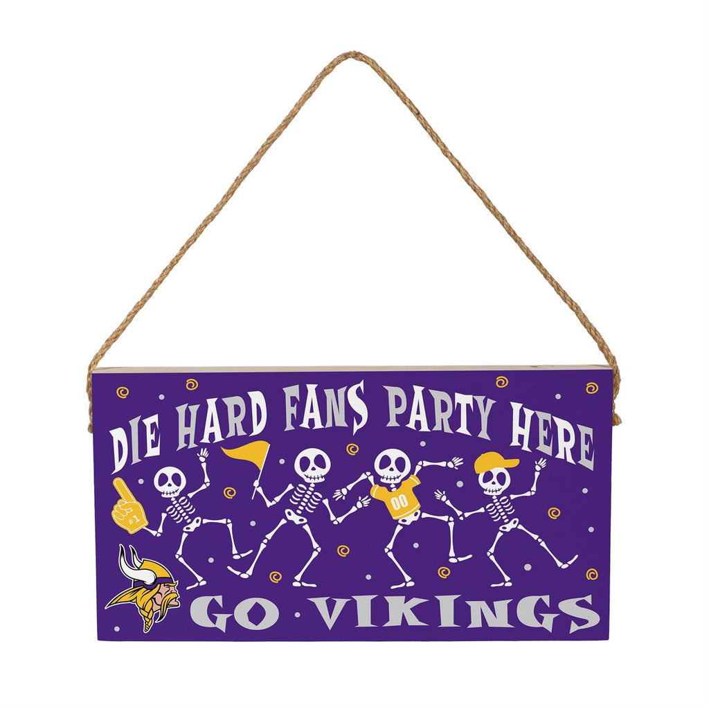 Celebrate the spooky season and your team spirit with the Minnesota Vikings Halloween Wood Wall Sign. Perfect for die-hard fans, this 6x11 inch sign is crafted from sturdy wood and features vibrant purple and gold colors. Skeletons dressed in team gear dance across the sign, making it a lively addition to your Halloween décor. Easy to hang with its included rope, this sign is ideal for indoor or sheltered outdoor use. Show your support and add a playful touch to your festivities with this unique wall decoration.