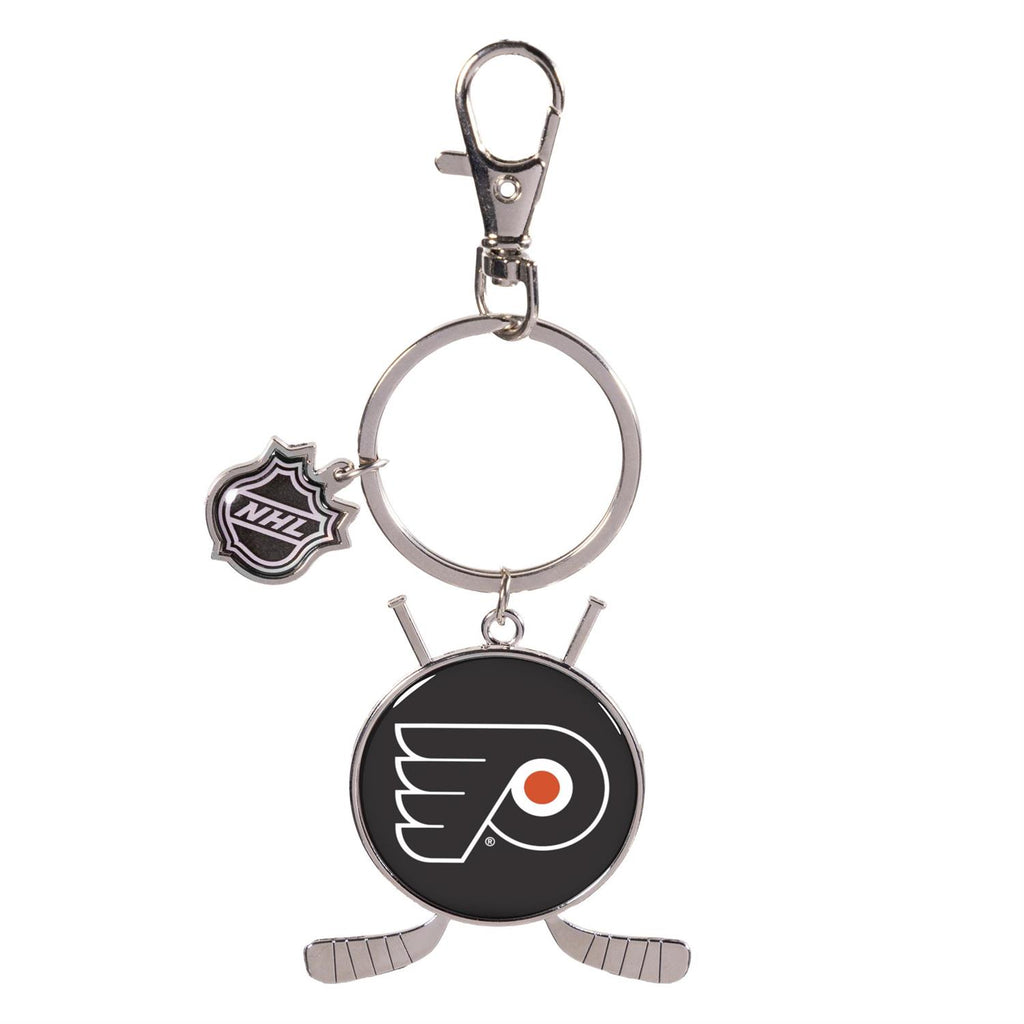 Show off your team pride with the Philadelphia Flyers Key Chain Charm. This compact and stylish accessory measures 1.75 inches in length, 0.15 inches in width, and 3.75 inches in height, making it perfect for adding a touch of fandom to your keys or bag. The design features the iconic team logo surrounded by hockey sticks, all crafted with durable metal. With its secure lobster clasp, this key chain is both functional and fashionable, ideal for any Flyers fan on the go.