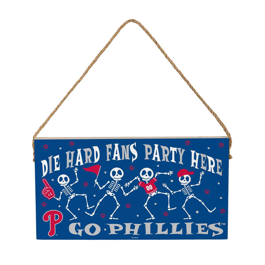 Celebrate Halloween and show your Philadelphia Phillies pride with this festive wood wall sign. Measuring 6 inches by 11 inches, this sign features fun skeleton graphics and team-themed elements, perfect for adding a spooky yet sporty touch to your home décor. Made from durable wood with a natural twine hanger, it's easy to display in any room. Whether you're hosting a Halloween party or just want to showcase your team spirit, this sign is a must-have addition to your seasonal decorations.