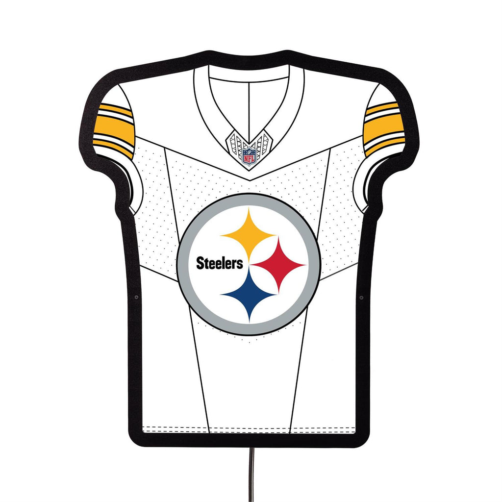 Light up your love for the Pittsburgh Steelers with this NFL Football Jersey Edgelite LED Decor. Perfect for any fan's game room, office, or man cave, this unique wall décor piece measures 23 inches by 23 inches, providing a striking display of team spirit. The jersey design highlights the iconic Steelers emblem, illuminated by energy-efficient LED lights, ensuring your fandom shines brightly. Its slim 0.38-inch profile allows for easy wall mounting, seamlessly blending into any space. Celebrate every touchdown and victory with this eye-catching piece of Steelers memorabilia.