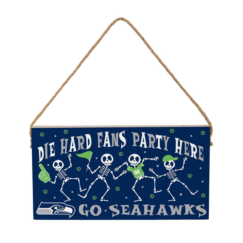 Show your team spirit this Halloween with the Seattle Seahawks Halloween Wood Wall Sign. Measuring 6x11 inches, this eye-catching sign is perfect for any die-hard Seahawks fan. Made from sturdy wood, it's designed to withstand indoor or outdoor use. The vibrant design features dancing skeletons and team colors, making it a festive addition to your home or party decor. Easily hang it with the attached rope for an instant touch of Seahawks pride this spooky season.