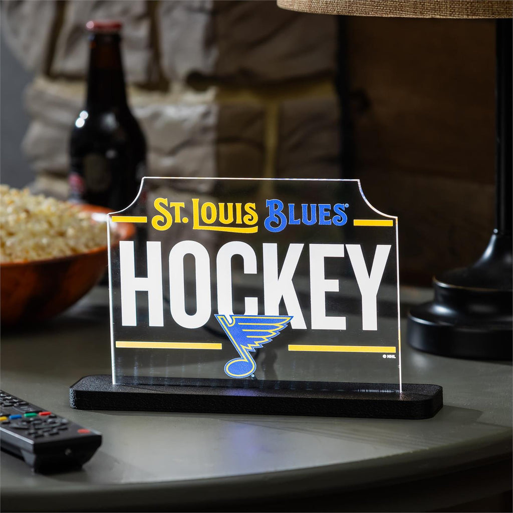 Illuminate your space with the St Louis Blues Hockey Rectangle Desklite LED Decor, a must-have for any fan's collection. With dimensions of 10 x 7 x 1.5 inches, this sleek and stylish piece is perfect for adding a touch of team spirit to your home or office. The LED lighting casts a vibrant glow, highlighting the bold team graphics and creating an eye-catching display. Ideal for desktops, shelves, or mantels, this desklite makes a great gift for fans of all ages. Elevate your décor with this standout piece of indoor wall art.