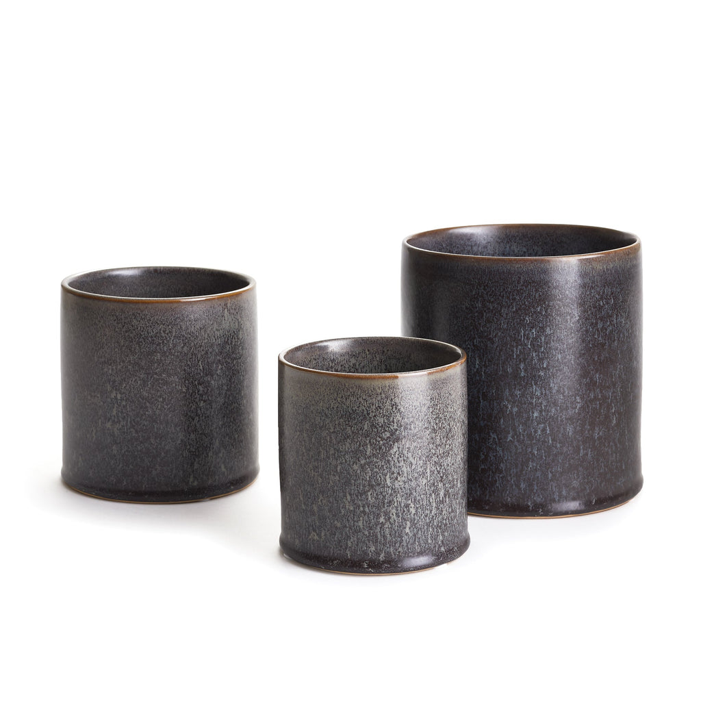The Aura Pots are available in sizes: 6.75 x 6.75 x 6.25 inches, 5.25 x 5.25 x 5 inches, and 4.25 x 4.25 x 4.5 inches. Each pot is crafted from high-fired stoneware and showcases a deep, aqueous gradating pattern, displaying a rich depth of color. They are available in Blue and Gray color variants.