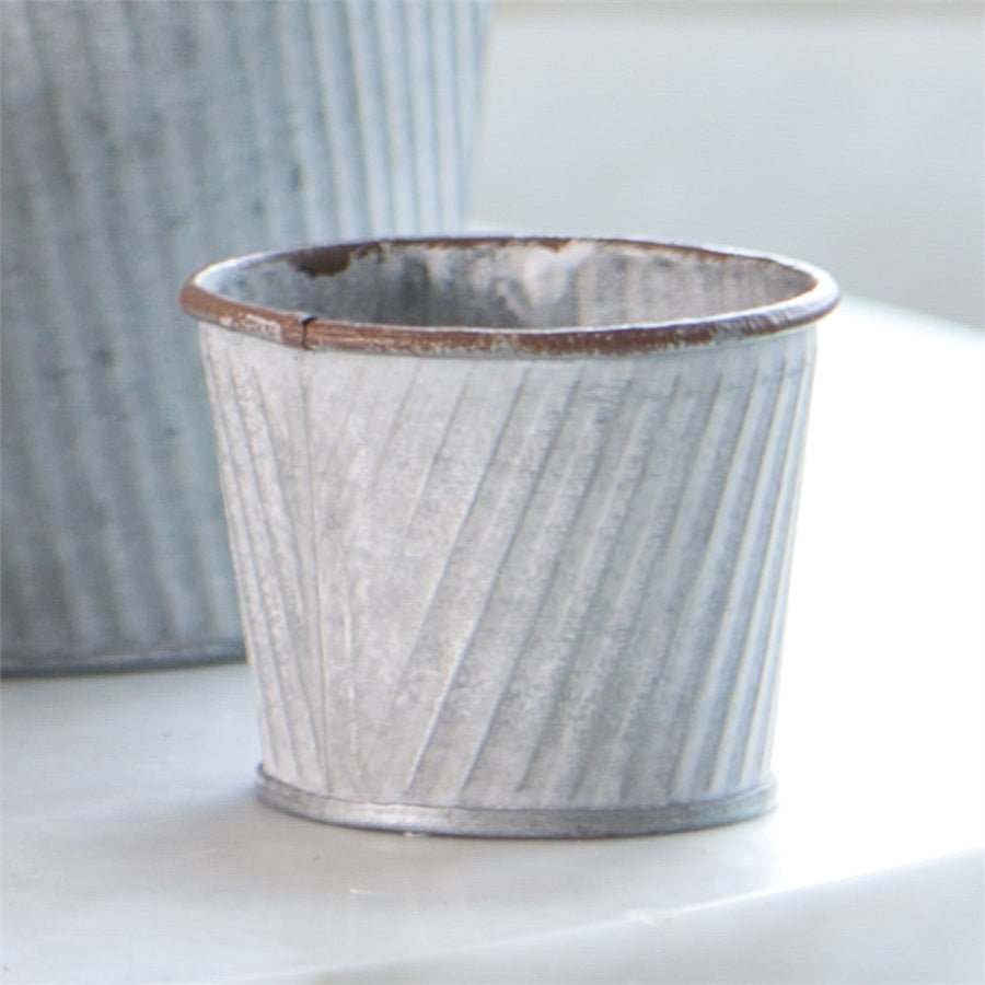 Gray galvanized metal with whitewash finish. Indoor use; use with a liner - not watertight.