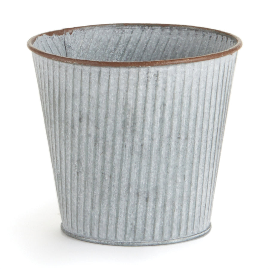 Gray galvanized metal with whitewash finish. Indoor use; use with a liner - not watertight.