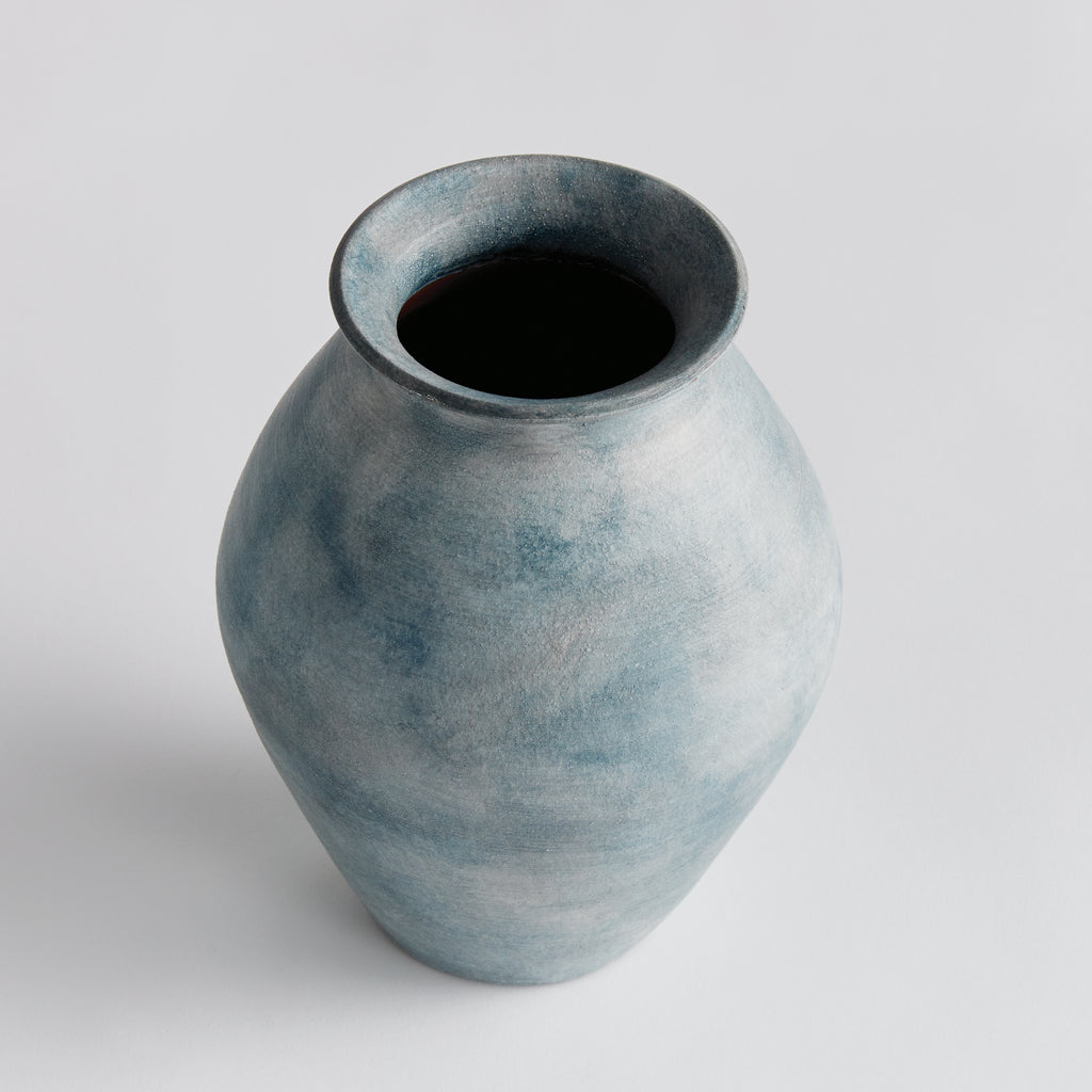 Hand thrown and perfectly imperfect, this terracotta vase brings the character. With subtle horizontal ribbing that shows through the gray-blue uneven matte glaze, it makes a lovely accent tucked in a bookshelf, or featured on a mantle or console.