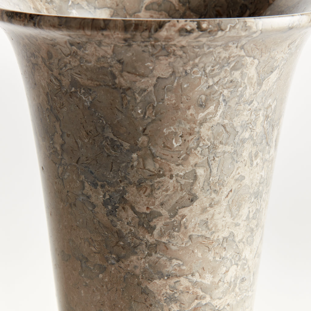 Honed to a semi-matte finish, this stunning marble is particularly known for its unique dark brown to light brown broad lines. The clay minerals found in this type of marble are what gives our footed vase its stunning unique brown veining. A beautiful accent atop home office desk, bookshelf or entry console.
