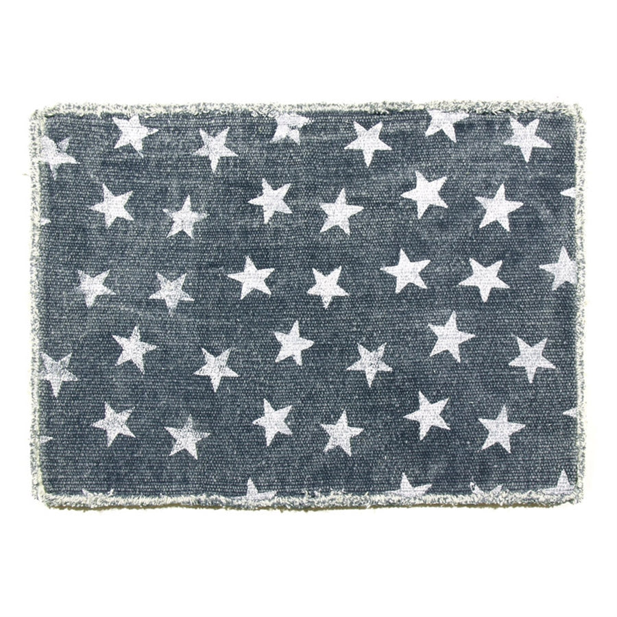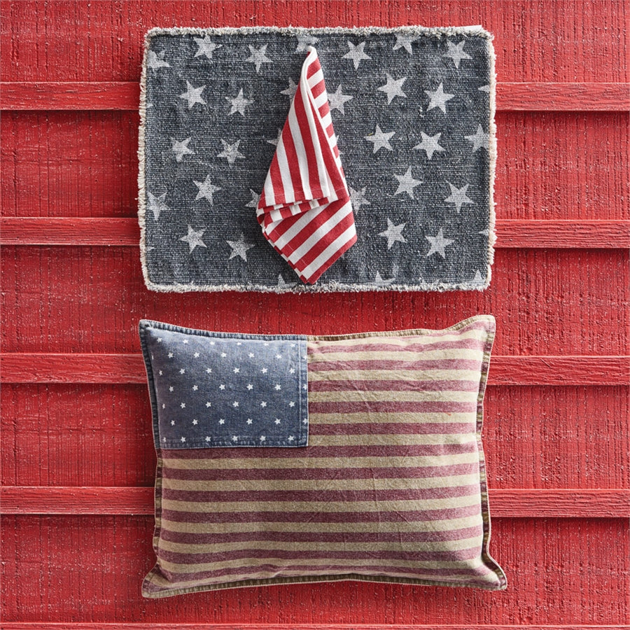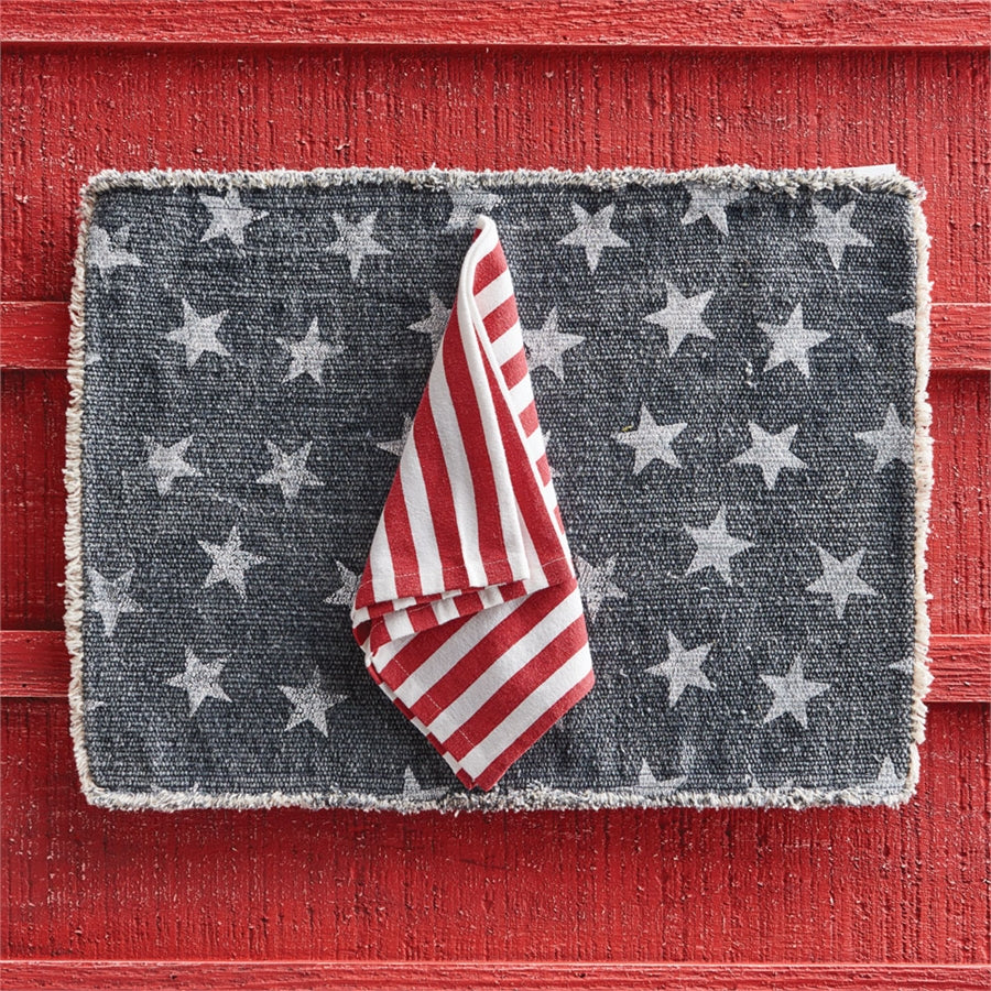 The Stars Placemat, in coarse woven cotton with frayed-edge border, has a weathered, time-worn look. The familiar white stars on a navy field coordinate with the Patriotic Stripe Napkin.