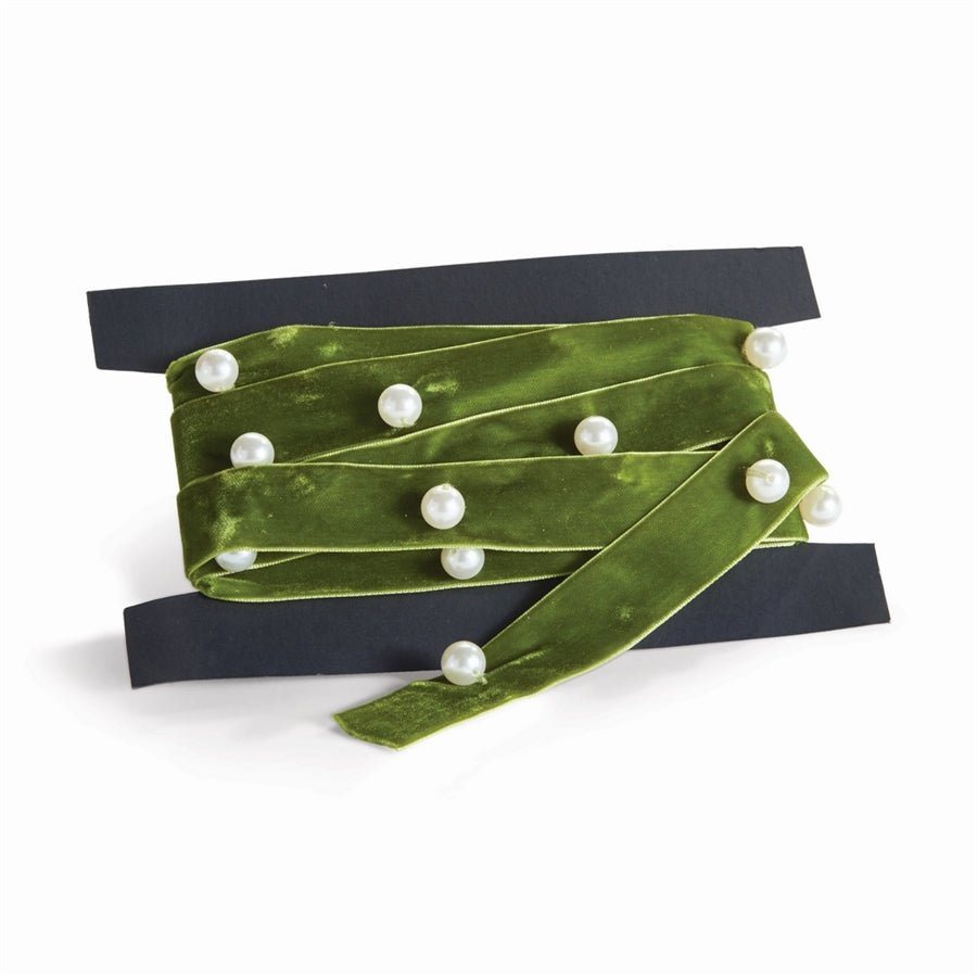 Pearl details on rich green velvet. Nothing could be more classic. This ribbon makes a stunning accent to wreath, tree and garland alike.