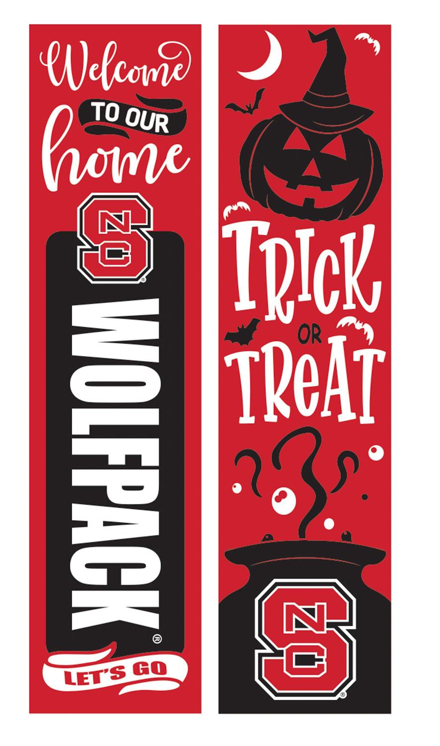 Showcase your school spirit and festive Halloween cheer with this versatile 46" double-sided porch leaner. Perfect for fans of North Carolina State University, this leaner features bold Wolfpack colors and branding on one side, while the reverse side celebrates the spooky season with a Halloween-themed design. Made from durable materials, it's designed to withstand the elements, making it an ideal addition to your front porch or entryway. The slim profile and lightweight construction make it easy to move and store when not in use.