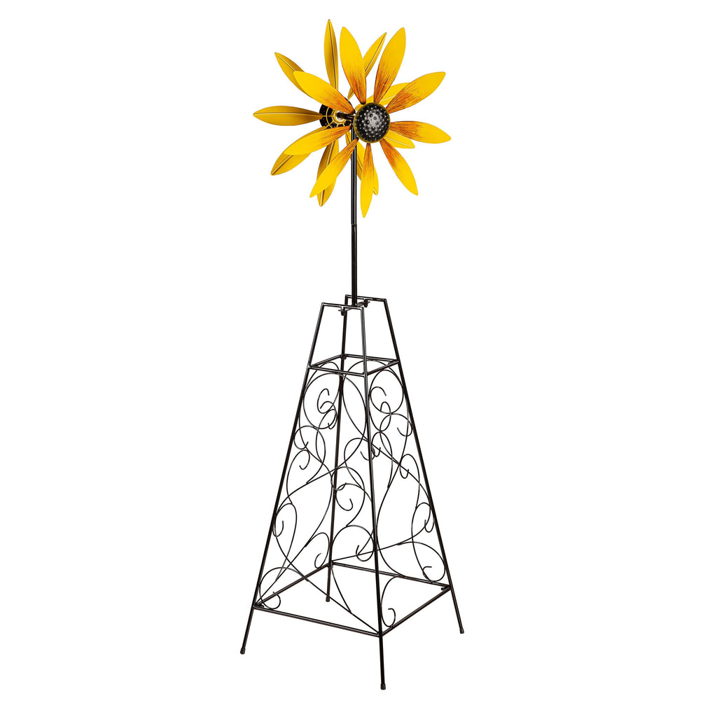 Enhance your garden with the Petal & Plow Wind Spinner, featuring a vibrant yellow flower design and a sturdy metal trellis. This decorative piece adds both motion and charm to any outdoor space.