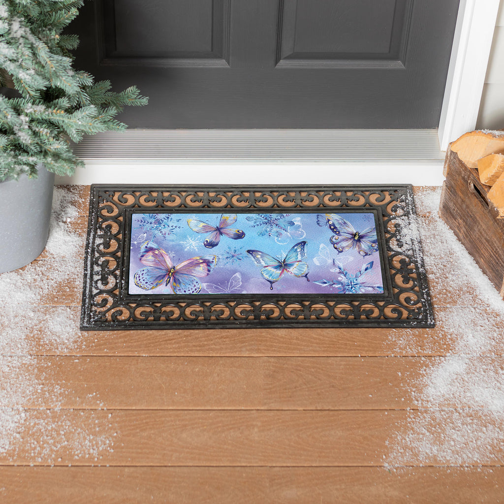 Transform your entryway with the enchanting Ice Castle Sassafras Switch Mat. This vibrant mat, designed to fit sassafras bases, features a captivating mix of butterflies and snowflakes in cool blue and purple hues. Perfect for the winter season, it adds a touch of whimsical elegance to your home décor. Crafted to withstand the elements, this mat is both functional and stylish, offering a warm welcome to guests while keeping dirt and debris at bay. Measuring 22 inches by 10 inches, it's an ideal size for any doorstep.
