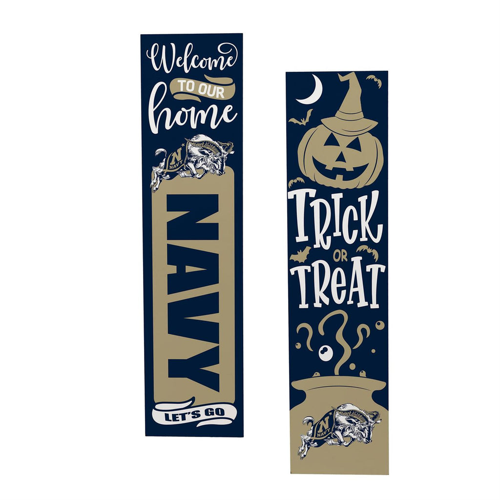 Celebrate your support for the US Naval Academy while embracing the Halloween spirit with this 46-inch double-sided porch leaner. Perfect for displaying on your front porch, this sign features a welcoming message on one side and a festive Halloween design on the other, making it versatile for seasonal decoration. Crafted from durable materials, it withstands outdoor elements, ensuring long-lasting use. The slim design allows it to fit neatly against your entryway, adding a touch of personalized charm to your home decor. Show off your Navy pride and seasonal flair with this eye-catching piece.