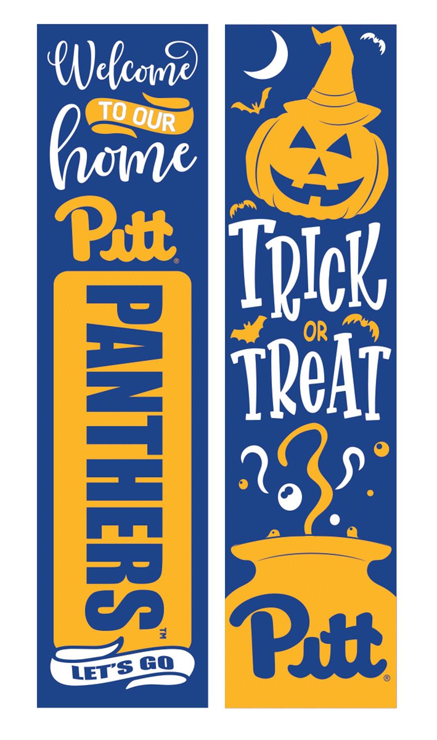 Celebrate Halloween and show off your school spirit with this 46" double-sided leaner featuring the University of Pittsburgh theme. Perfect for adding a festive touch to your porch, this porch leaner showcases vibrant blue and gold colors, and playful imagery like a jack-o'-lantern and a witch’s hat. Made from durable materials, it’s designed to withstand the elements, ensuring that your Halloween decor remains eye-catching throughout the season. Whether you're welcoming trick-or-treaters or simply celebrating your favorite team, this leaner is a delightful addition to any home.